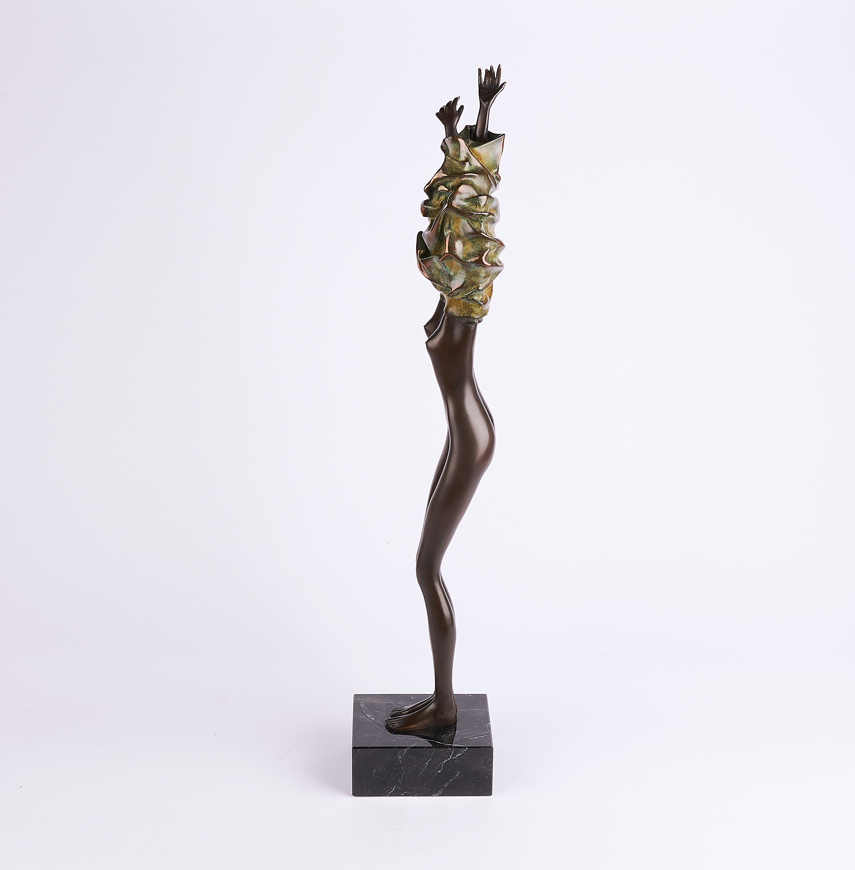 Technik: Bronze, braun und teilweise grüngelb patiniert, auf Marmorsockel.