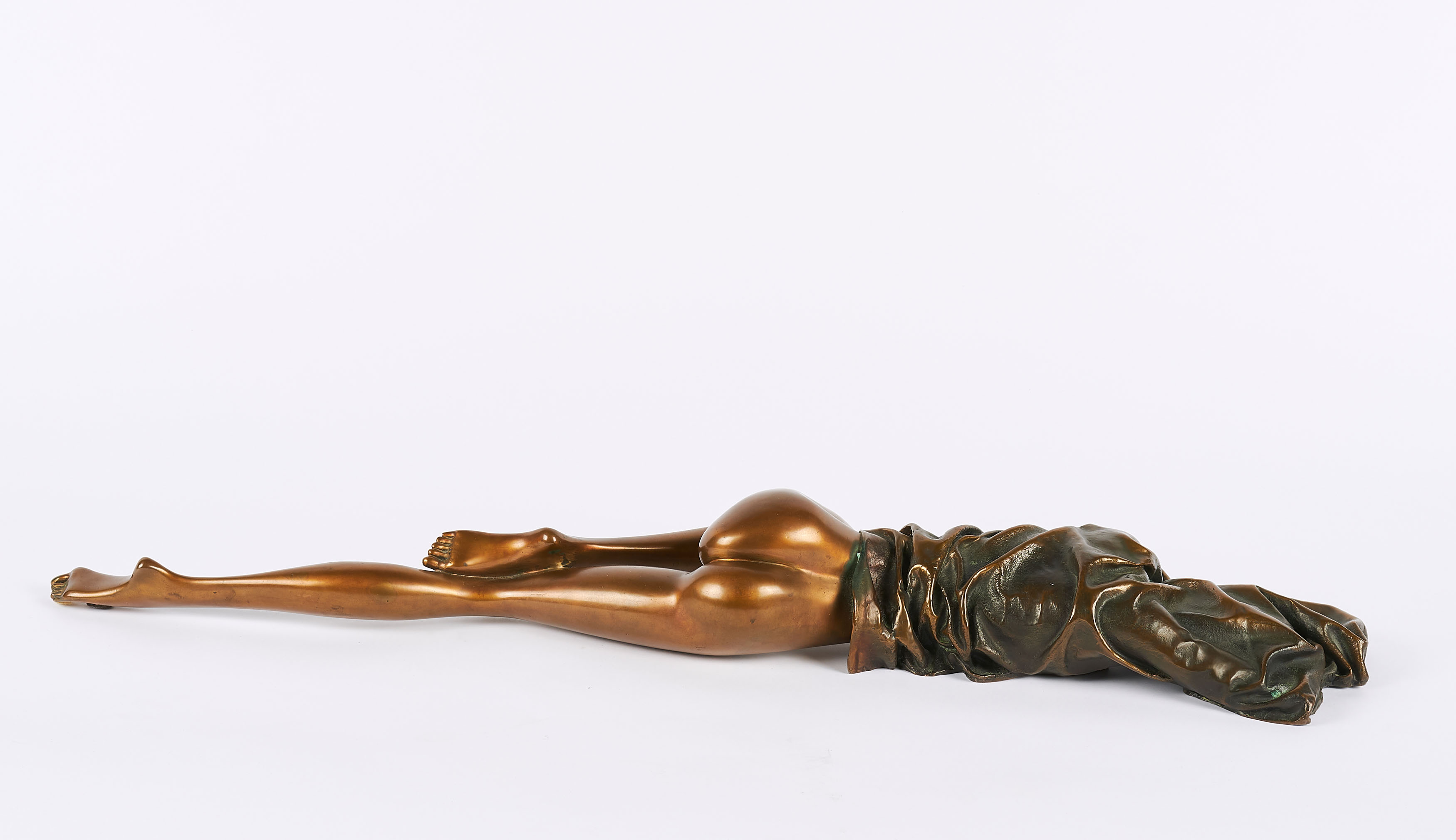Partiell einsetzende Grünspankorrosion im nicht polierten Bereich, insbesondere in den Vertiefungen, aber auch im Bereich der Zehen. Hier auch Anlagerungen von Staub. Minimale Wasserflecken im Bereich der Oberschenkel und des Gesäßes. Montierter Filz an der Unterseite. Hier Klebereste dessen. Ansonsten befindet sich die Skulptur in einem sehr guten Zustand.