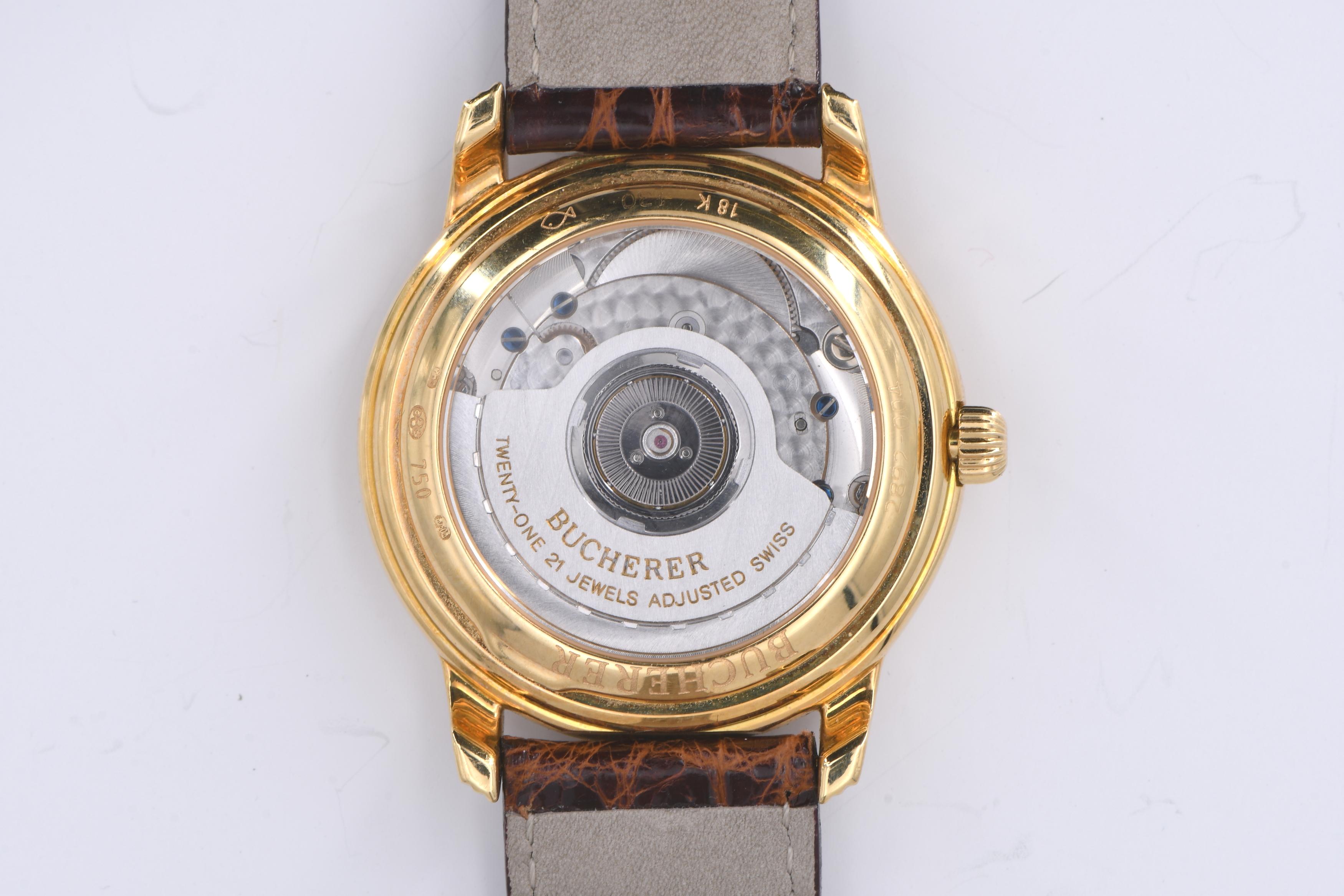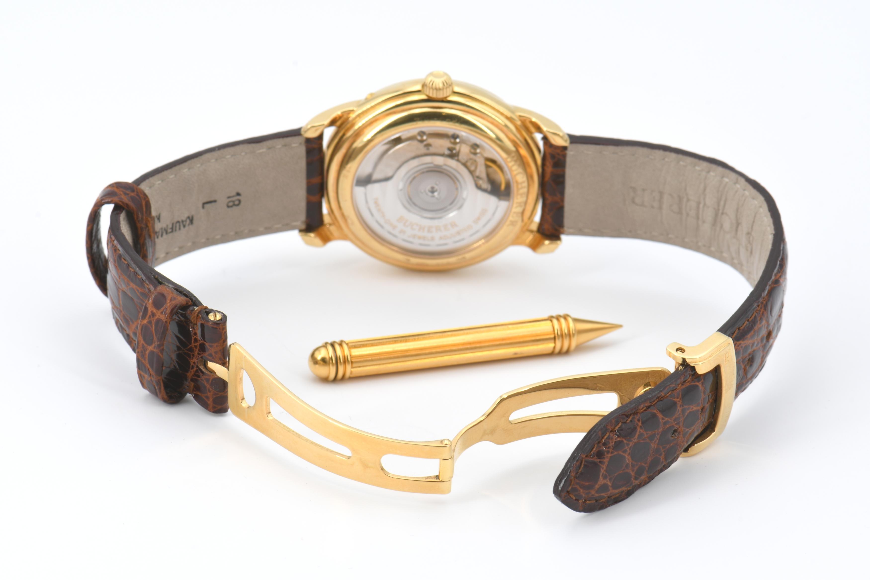 21 Rubine, Schweizer Ankergang. Datum/Tag, Jahresindikation, Monat, Mondphase, Zentralsekunde. Uhrensteller, Box, Garantie von Bucherer 08/2000 anbei.
