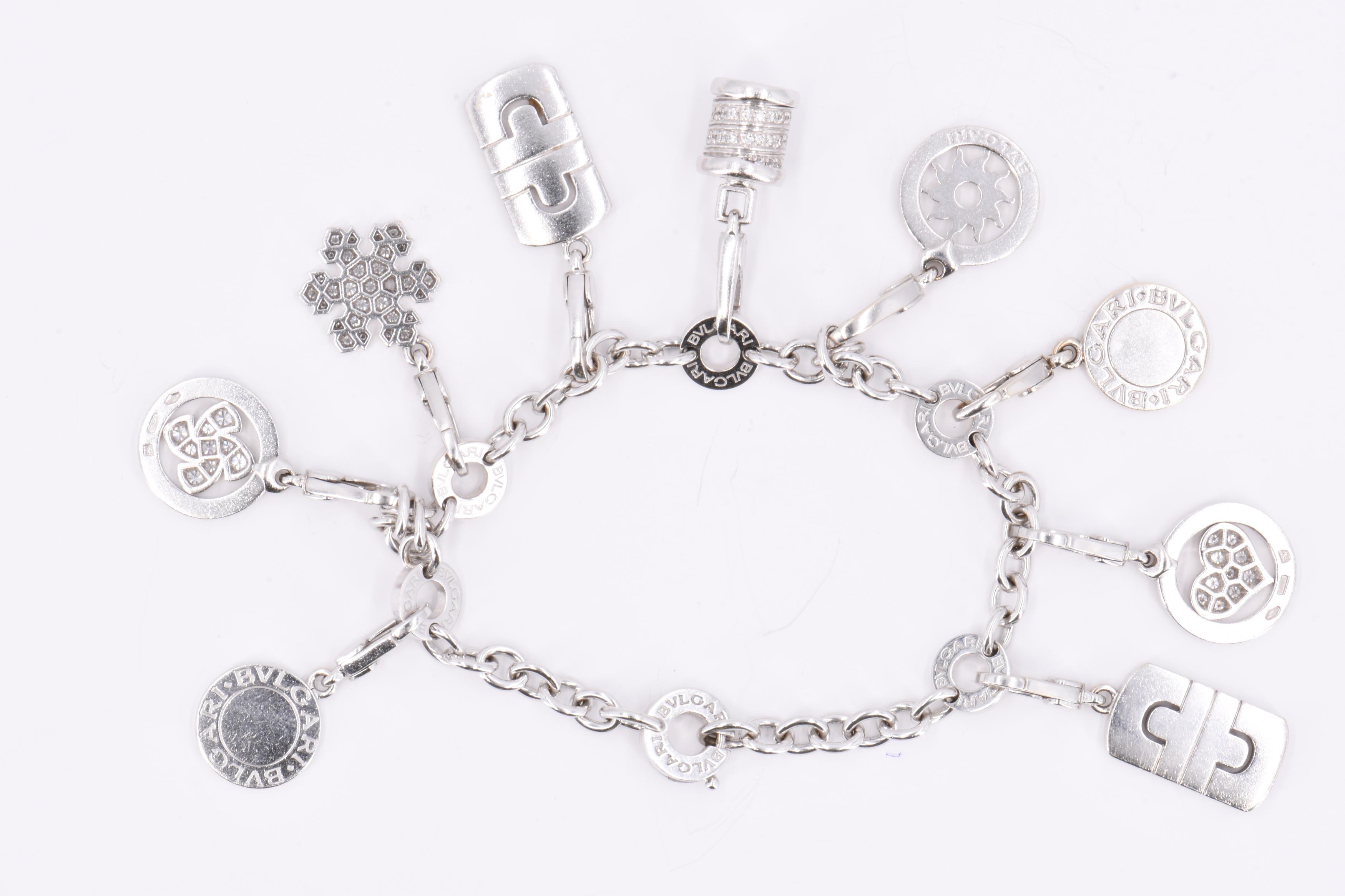 Beschreibung: 9 Anhänger, jeder signiert "BVLGARI". 1 Diamant am Schneeflocken-Anhänger fehlend.