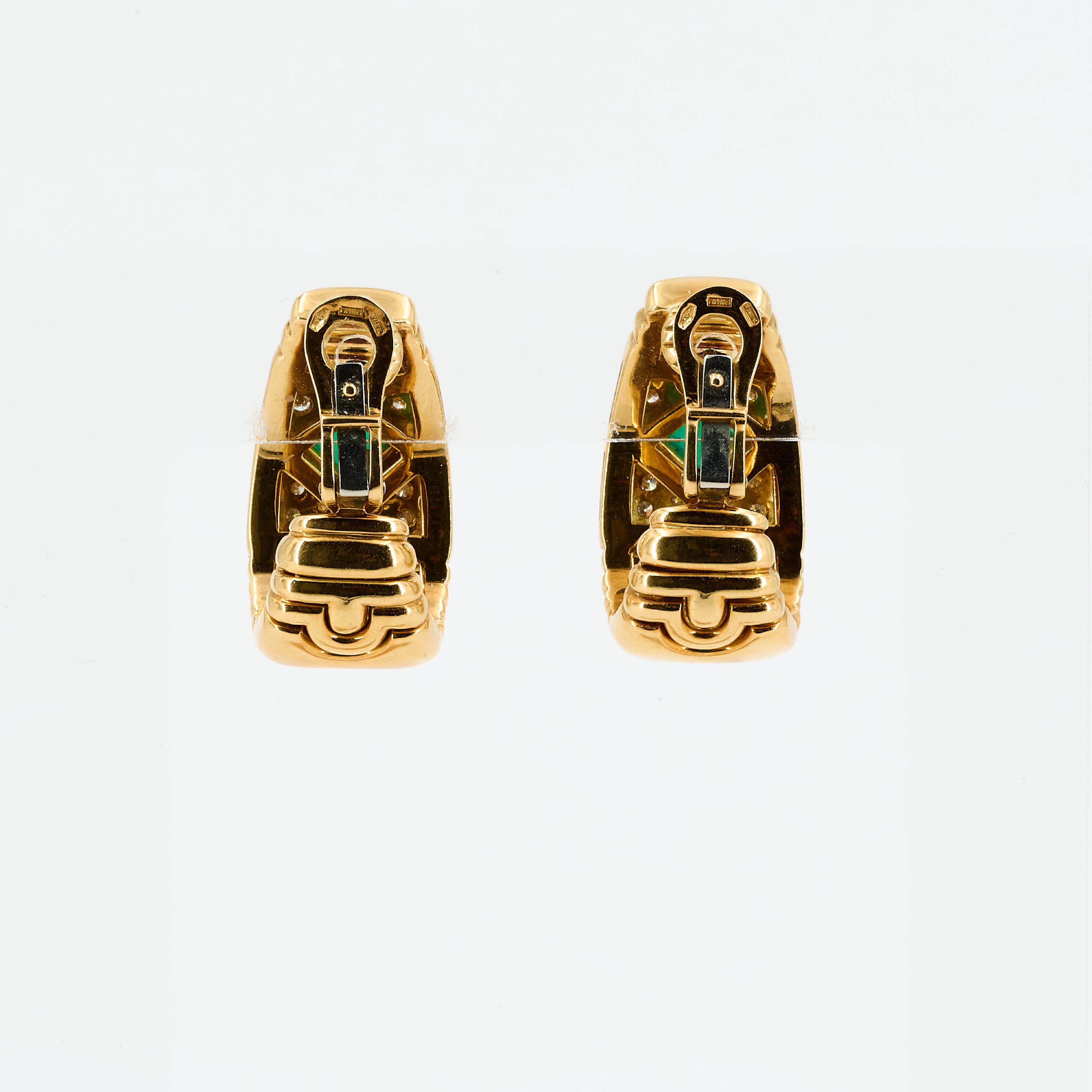 Beschreibung: Signiert "BVLGARI". Ohrclips mit dem unverwechselbaren Klammerform-Element, besonders prachtvolle Ausführung mit leuchtenden Smaragden, geschliffen zu hohen Cabochons, umgeben von Diamanten.