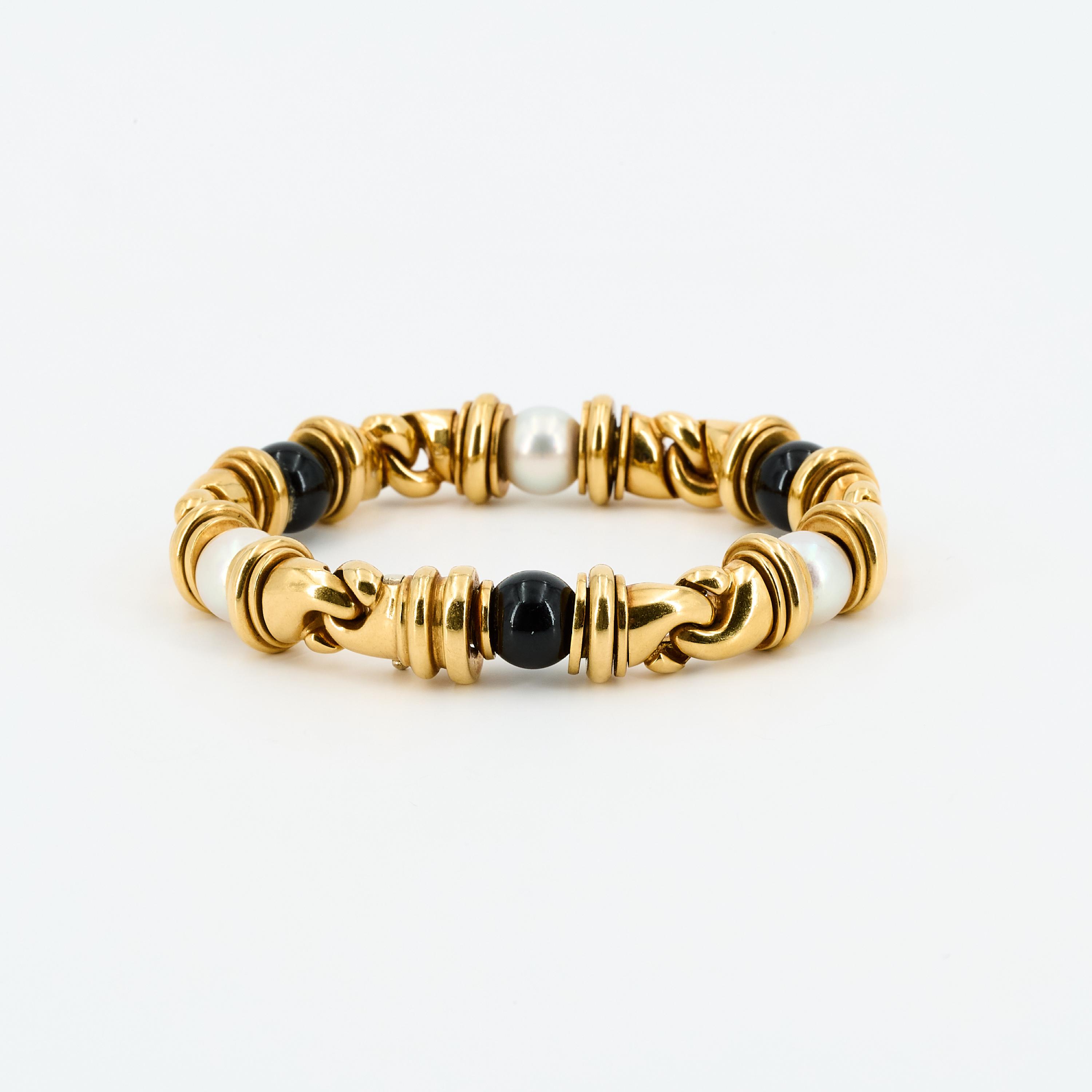 Goldglieder im Wechsel mit Onyx-Kugeln und Perlen.