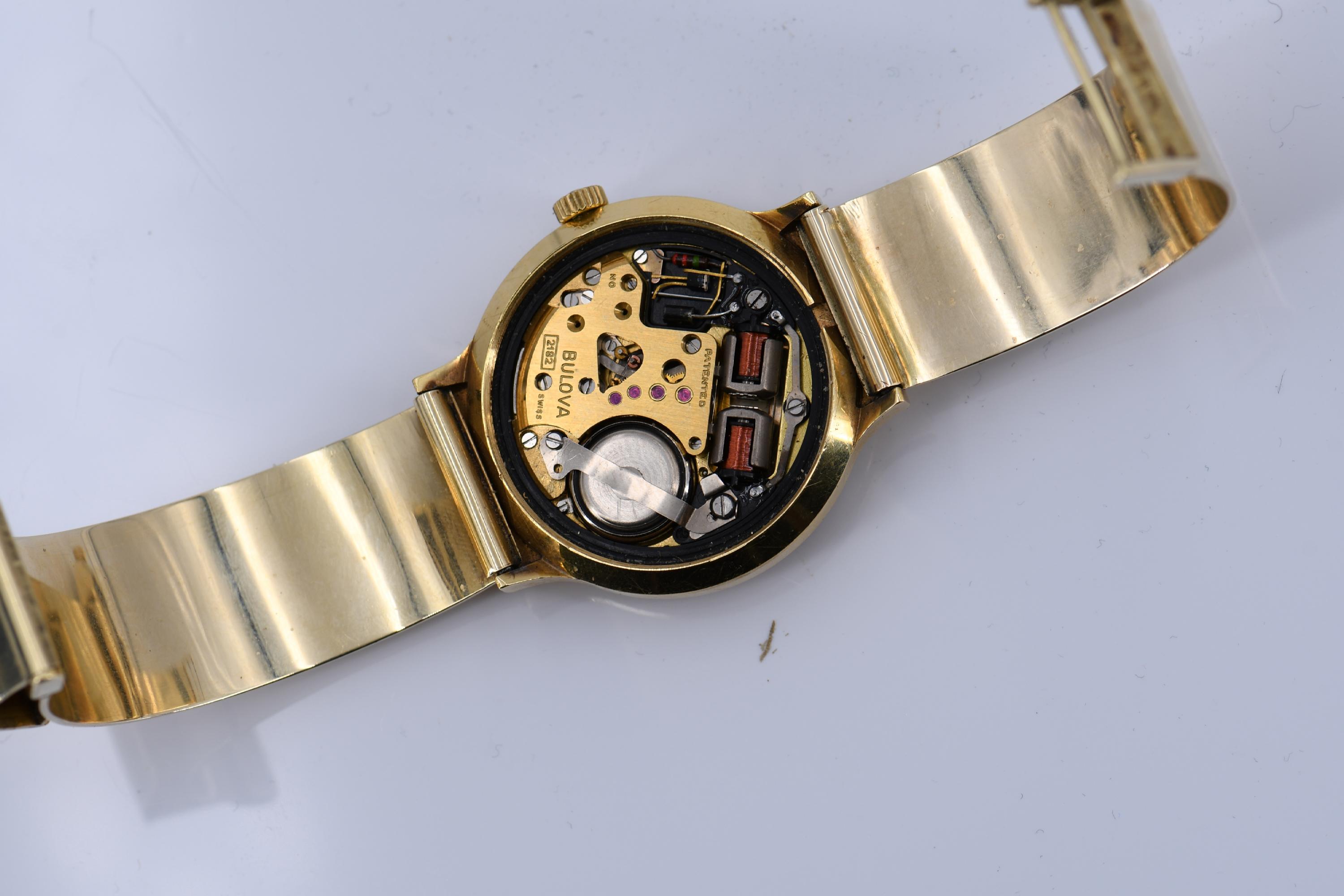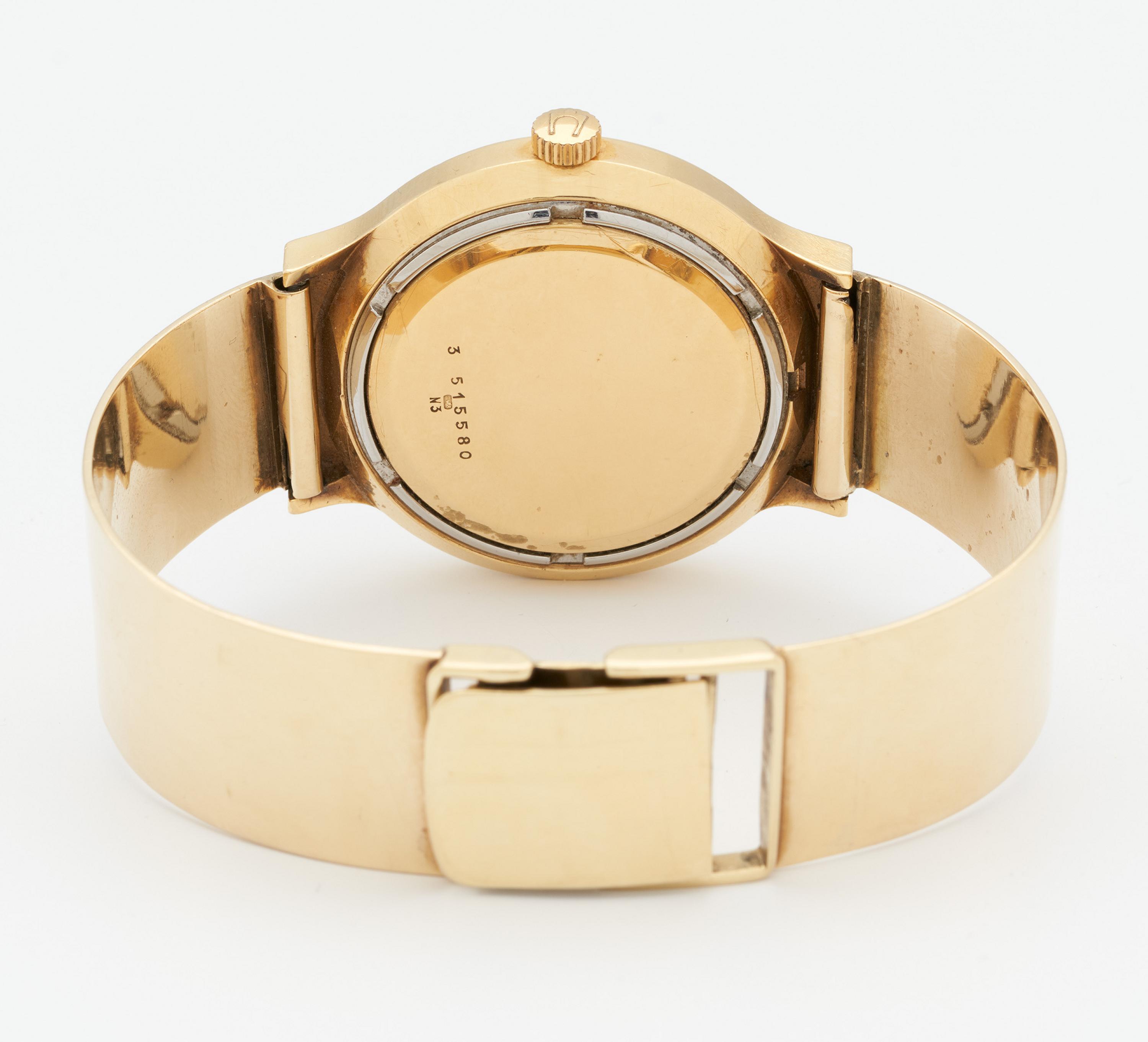 Gehäuse/Armband: Gehäuse golden, Armspange 585/- Gelbgold, Zffbl. und Zeiger golden, aufgesetzte Indizes, Tages- und Datumsanzeige.
