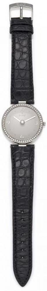 Gehäuse/Armband: Edelstahl, diamantgeziert, schwarzes Lederband mit Orig.-Dornschließe, Zffbl. lackiert, bedruckt, Zeiger silbern.
