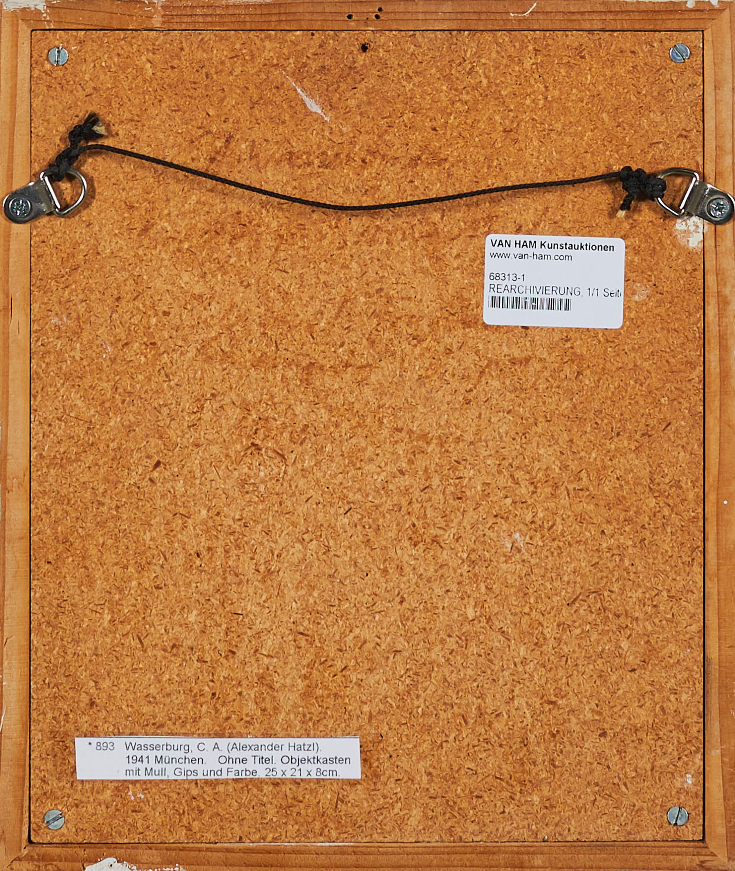 Objektkasten mit kleineren Bestoßungen an den Kanten. Hier partiell auch Klebereste und kleinere Verschmutzungen. Verso montierte Aufhängevorrichtung. Ansonsten in sehr gutem Zustand.