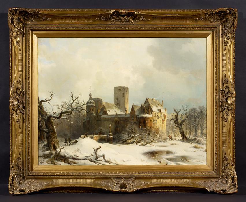 Burg in Winterlandschaft. Signiert und datiert unten links: C Hilgers. 71. Öl auf Leinwand. Auf Holz gezogen. 72 x 95cm. Rahmen.