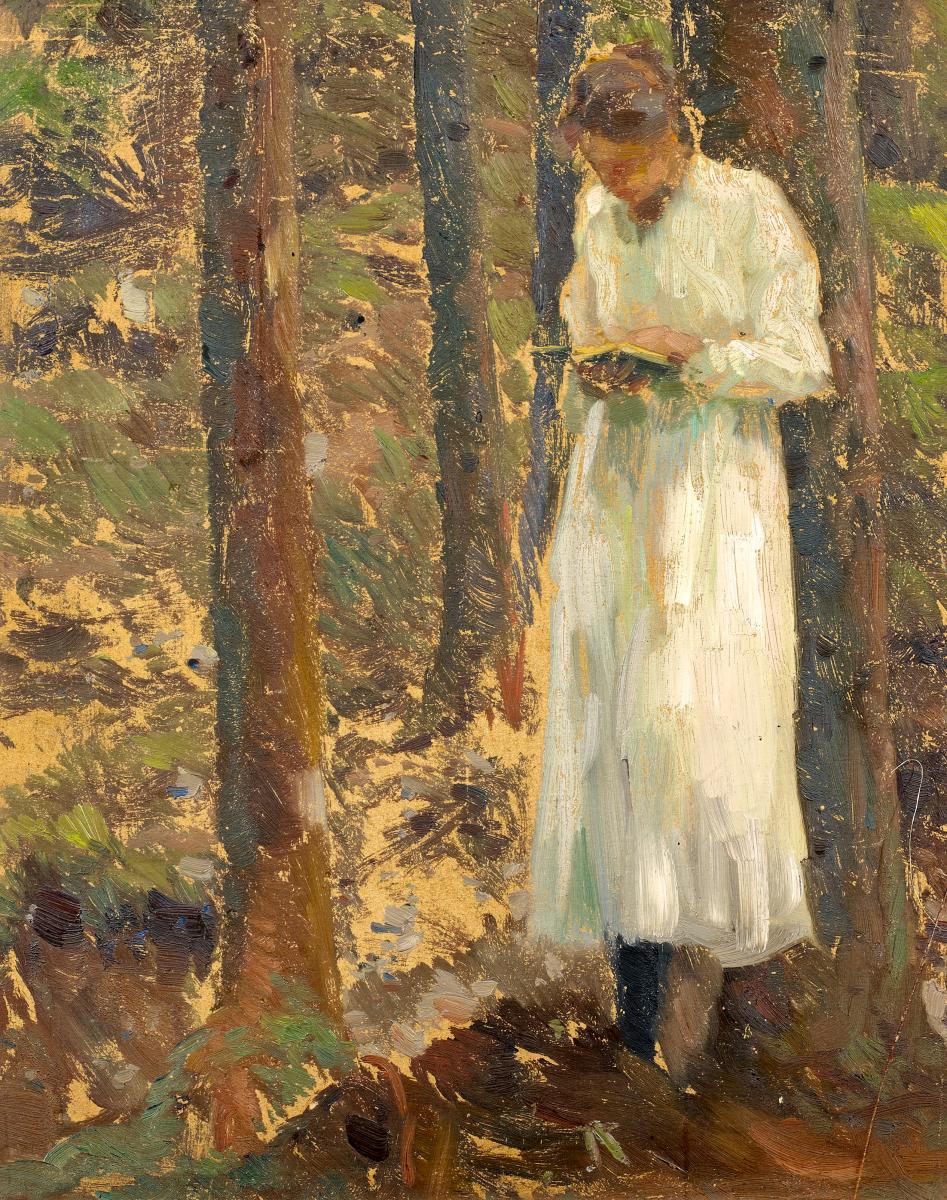 Lesende. Dora mit Buch zwischen Bäumen. Öl auf Karton. 41,5 x 35cm. Rahmen.