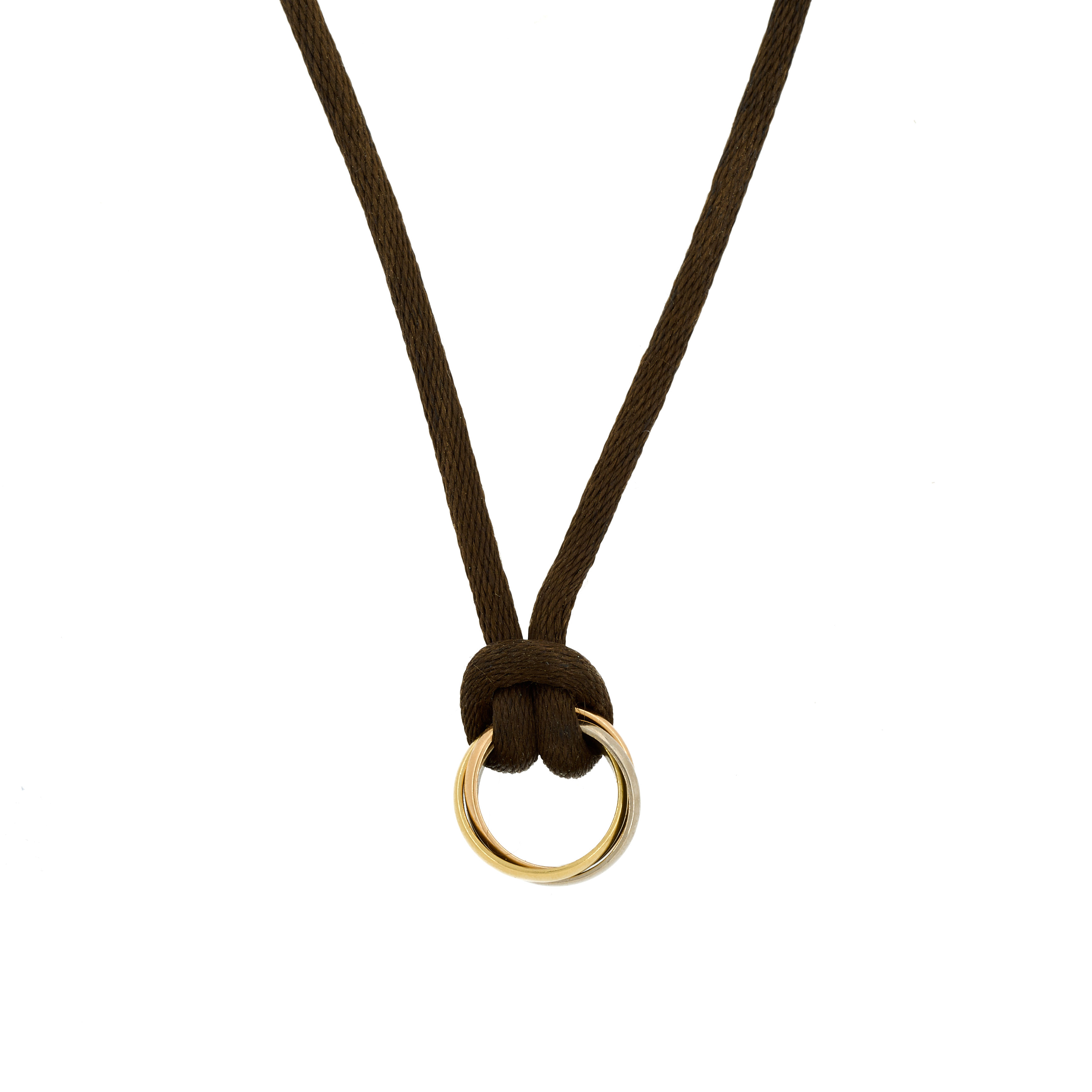 Klassische Anhängerkette mit Trinity-Anhänger aus dem Hause Cartier. Die braune Seidenkordel ist mit einer Gelbgold-Hülse zur Längenanpassung sowie zwei Gelbgold-Kappen an den Enden versehen. Seriennummer „RY 9420“ sowie Individualgravur im Roségold-Ring.