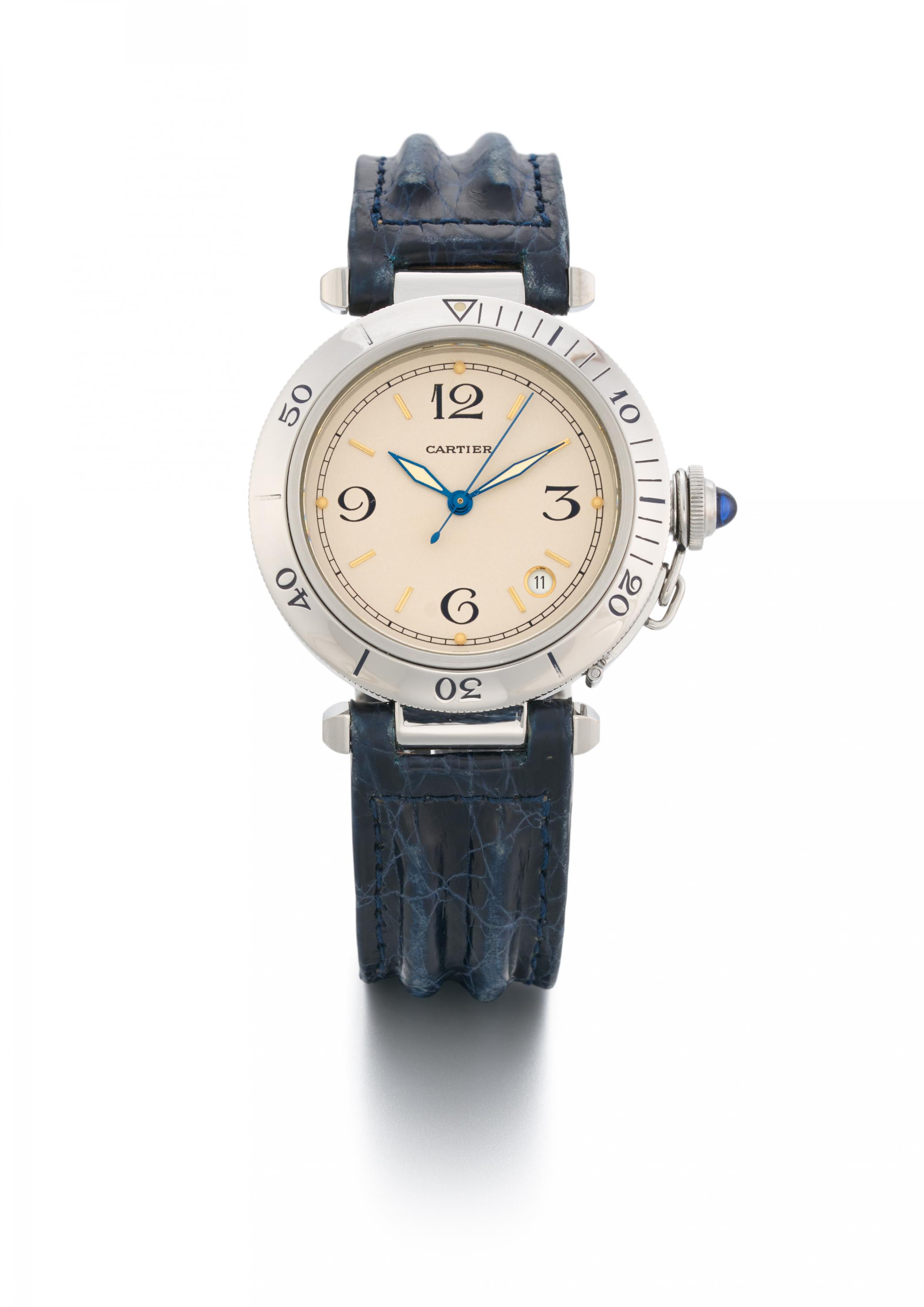 Gehäuse/Armband: Stahl, Lederband mit Faltschließe, Zffbl. silbern, Zeiger gebläut, arabische Ziffern schwarz, Indizes golden.