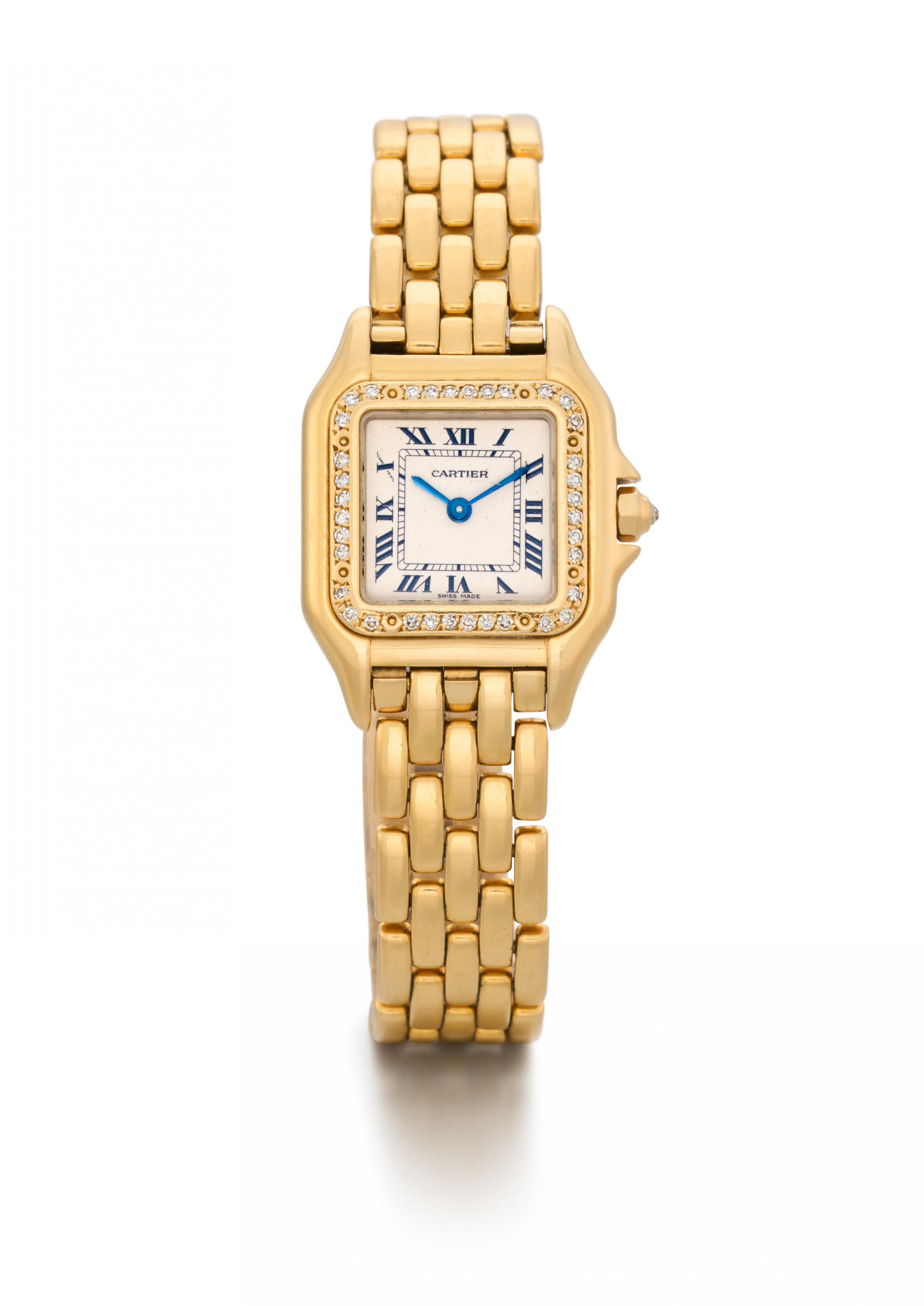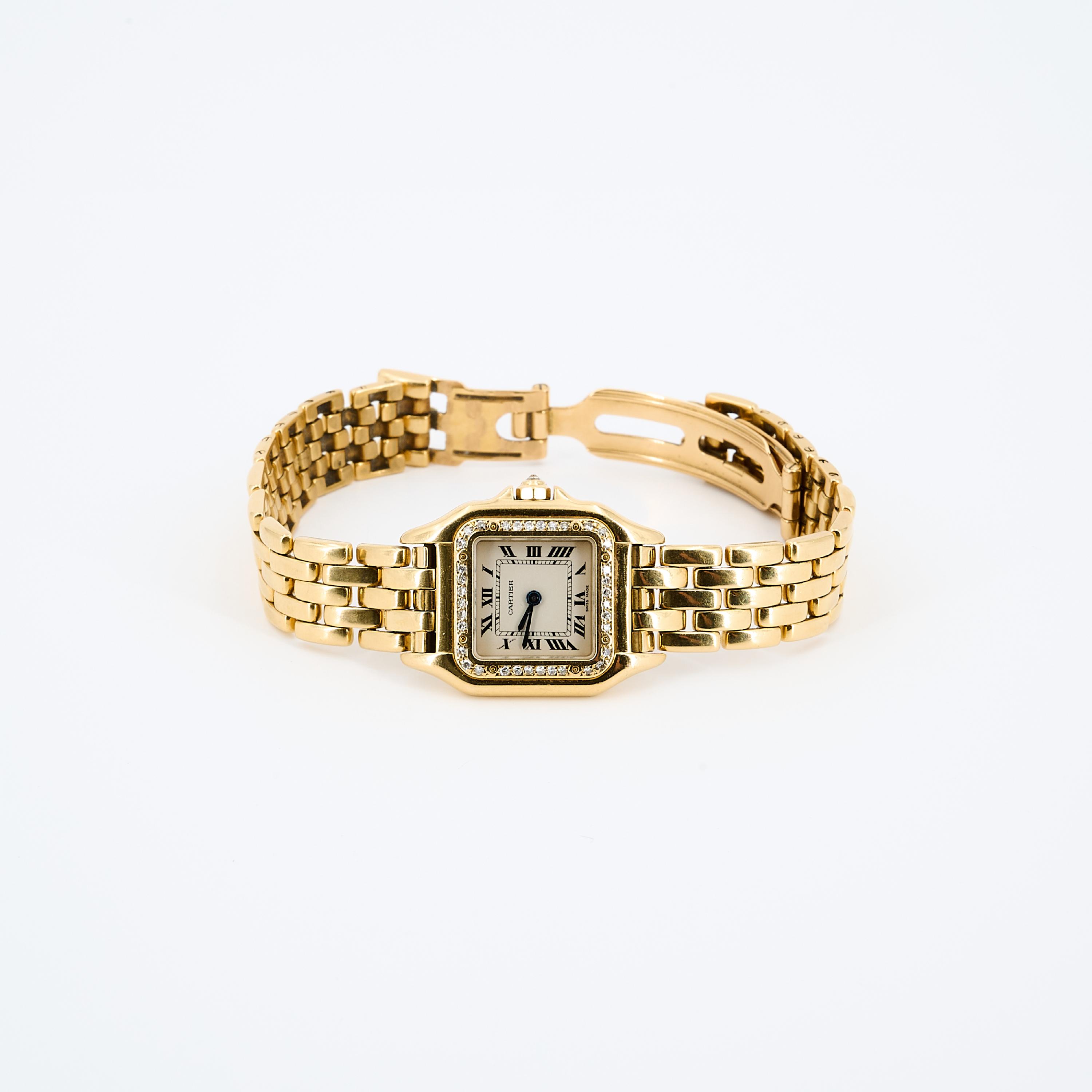 Gehäuse/Armband: 750/- Gelbgold mit Brillantbesatz, 36 Diamanten im Achtkant-Schliff zus. ca. 0,18 ct., Gliederarmband mit Faltschließe, Zffbl. silbern, Zeiger gebläut, römische Ziffern schwarz.
