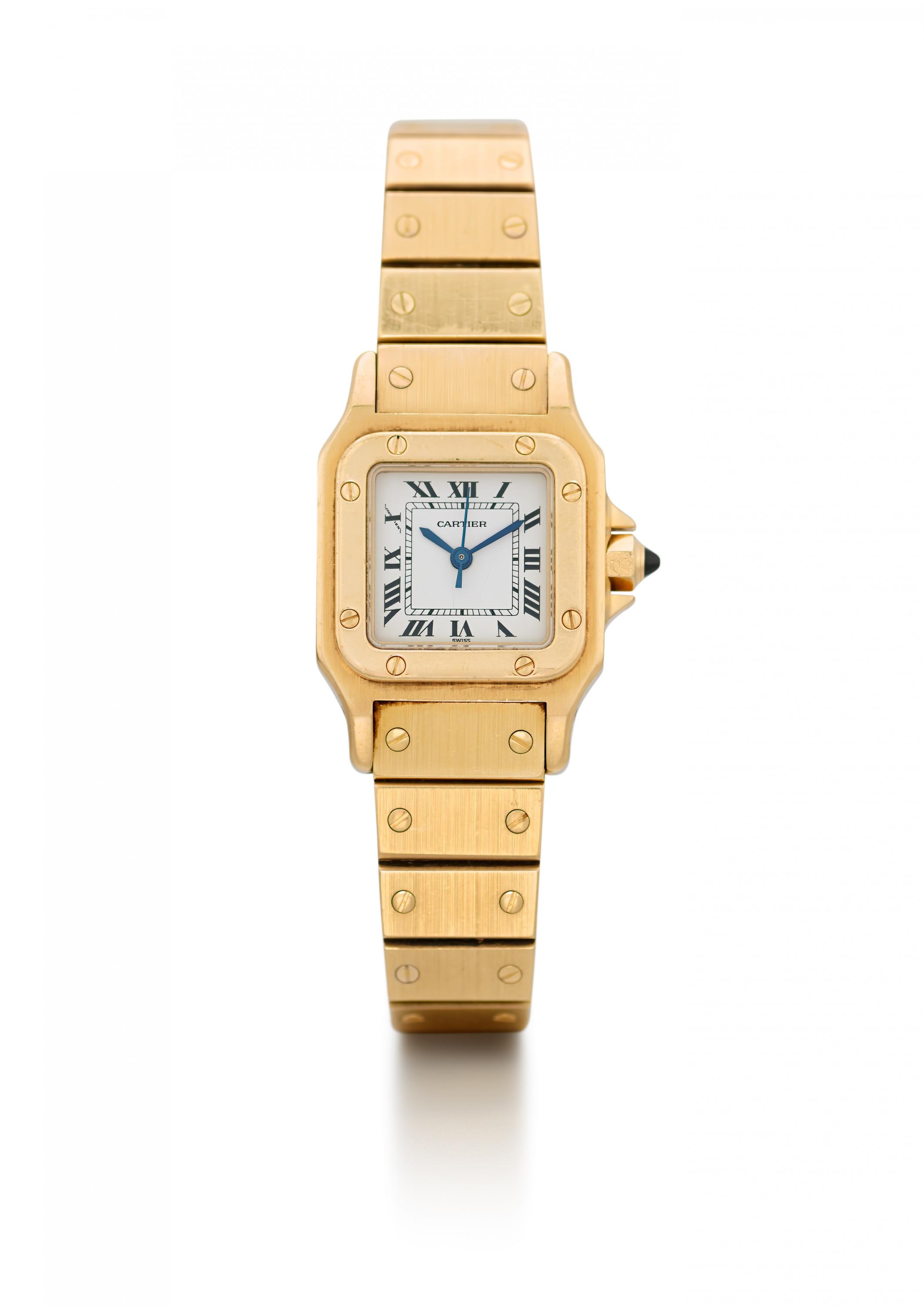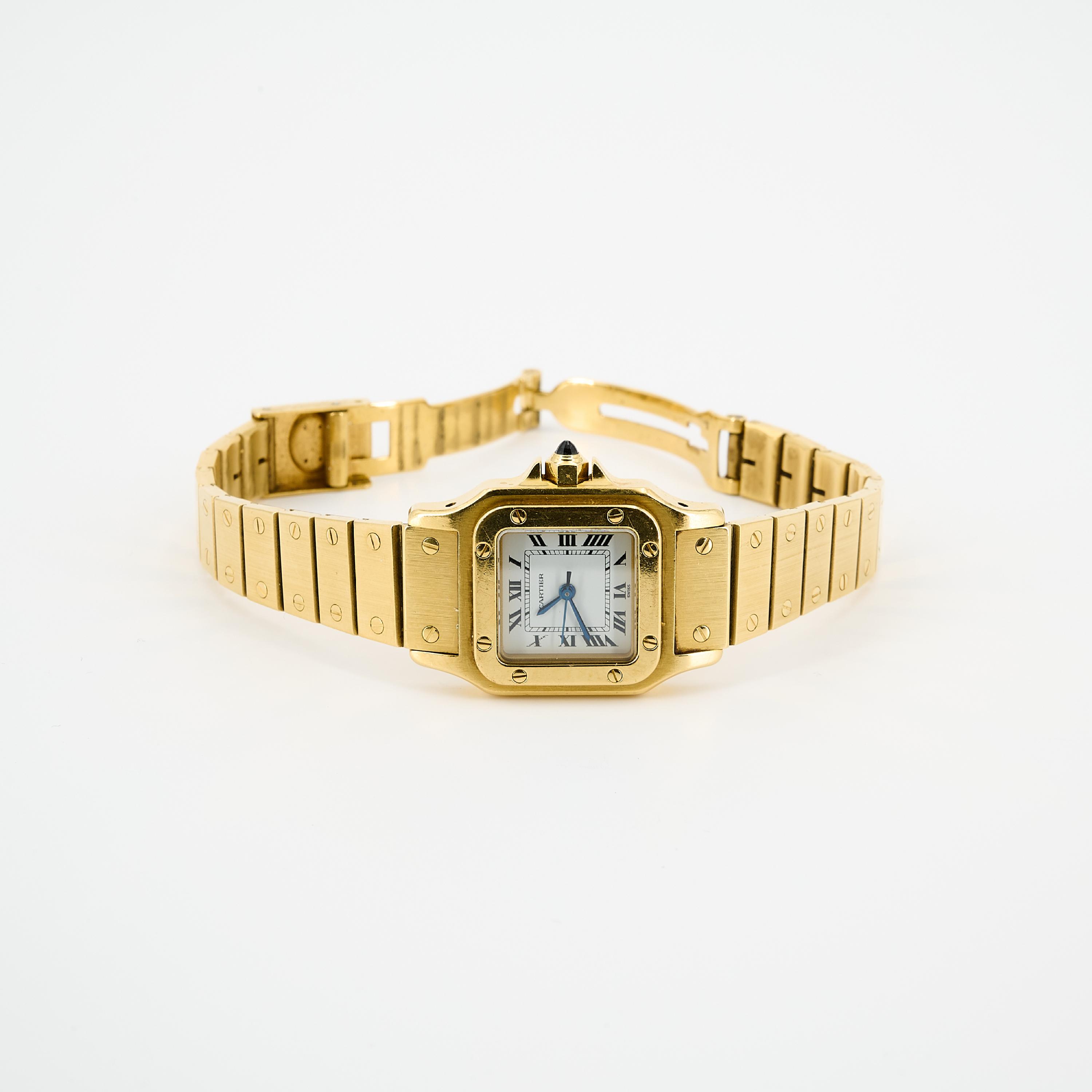 Gehäuse/Armband: 750/- Gelbgold, Gliederarmband mit Faltschließe, Zffbl. weiß, Zeiger gebläut, römische Ziffern schwarz.