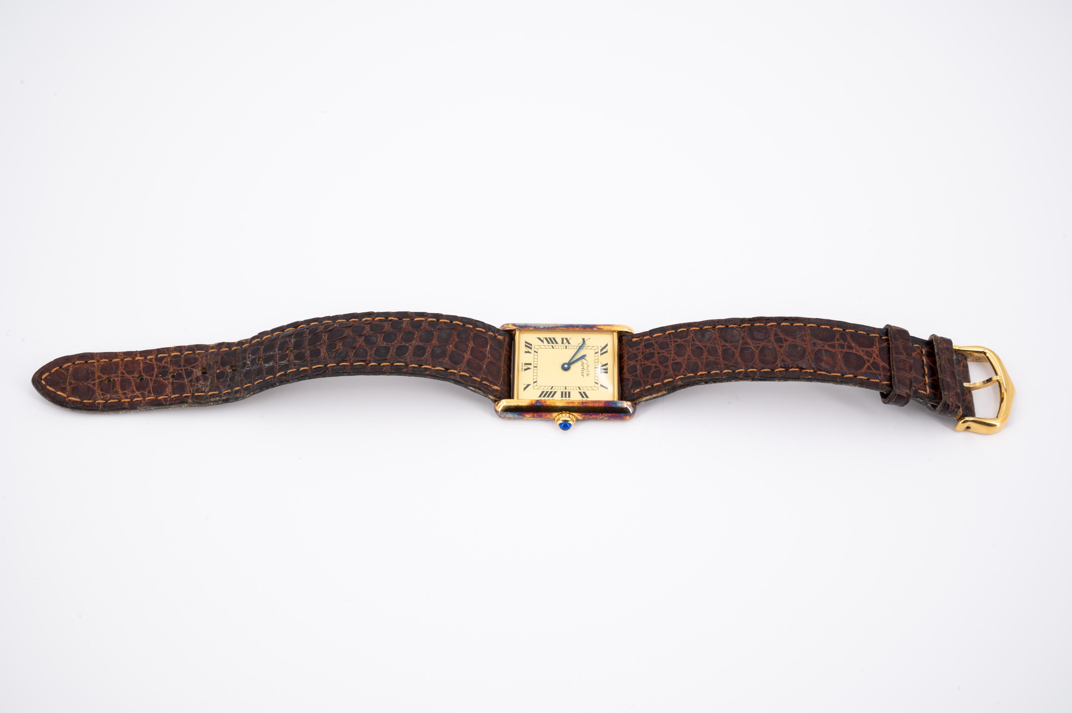 Gehäuse/Armband: 925/- Silber, vergoldet, braunes Lederarmband mit Dornschließe, vergoldet, Zffbl. cremefarben lackiert, Indizes schwarz, Zeiger gebläut.
