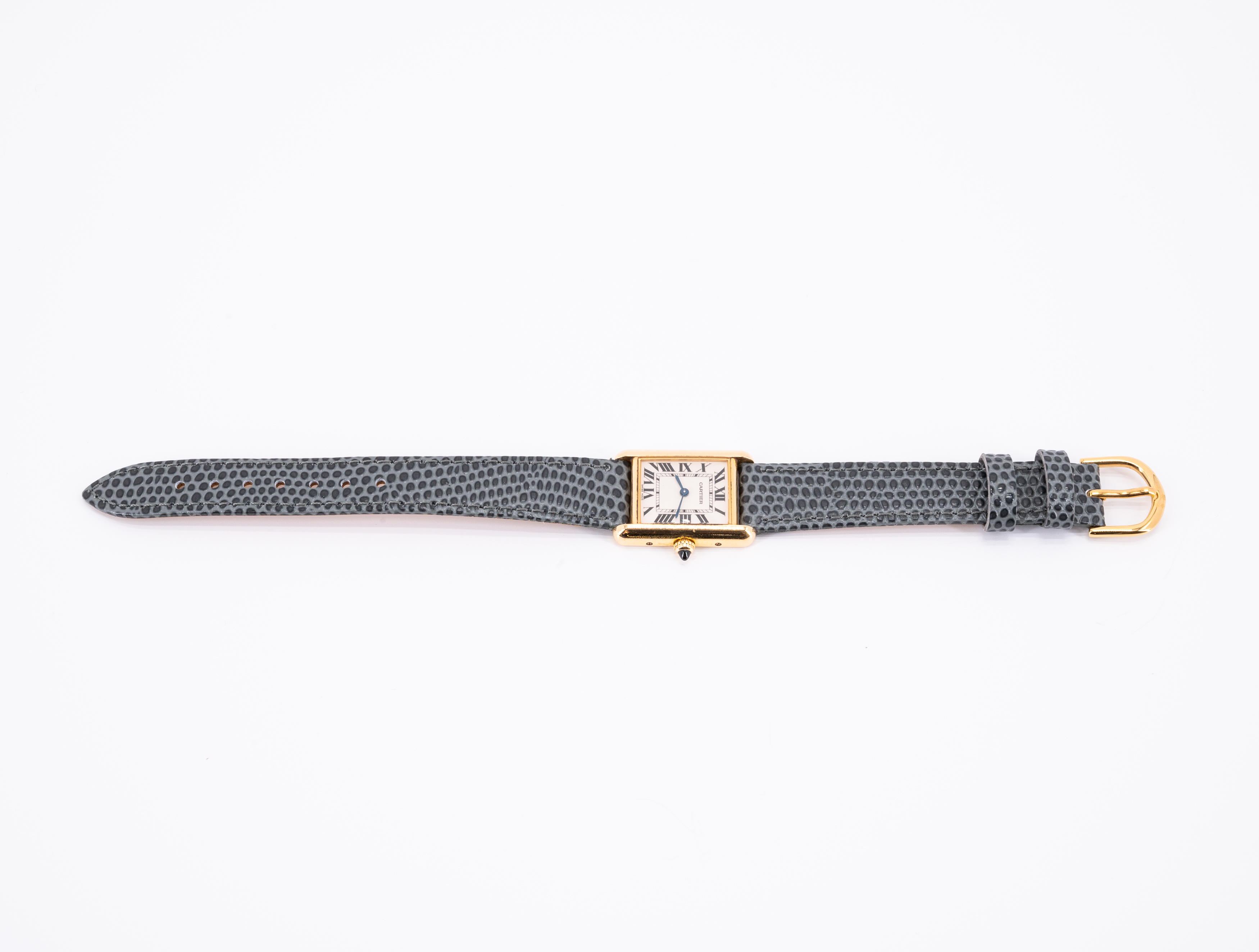 Gehäuse/Armband: 750/- Gelbgold, Lederarmband mit Dornschließe, Zffbl. weiß, Zeiger gebläut, römische Ziffern schwarz.