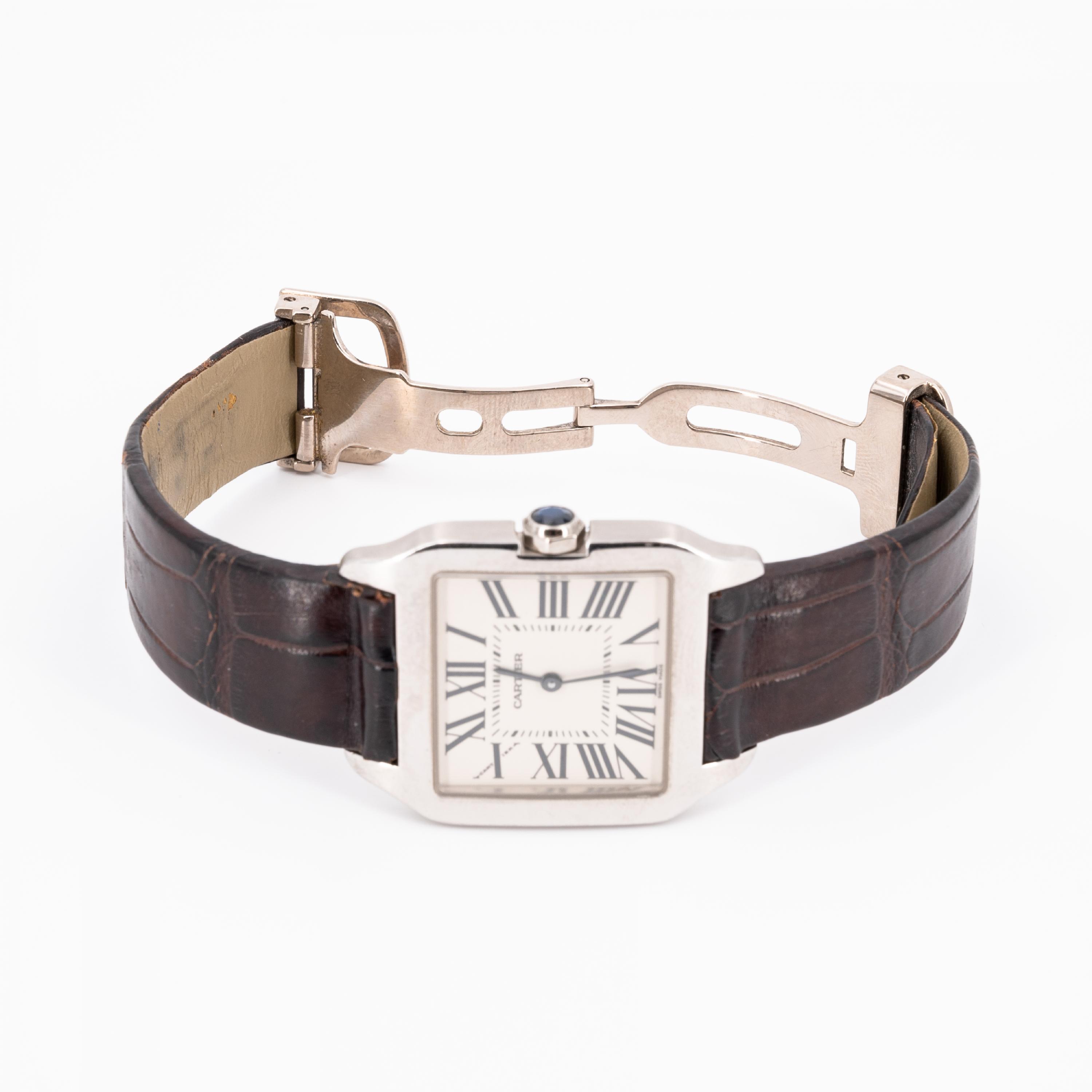 Gehäuse/Armband: 750/- Weißgold, Lederarmband mit Dornschließe, Zffbl. weiß, Ziffern schwarz, Zeiger schwarz.