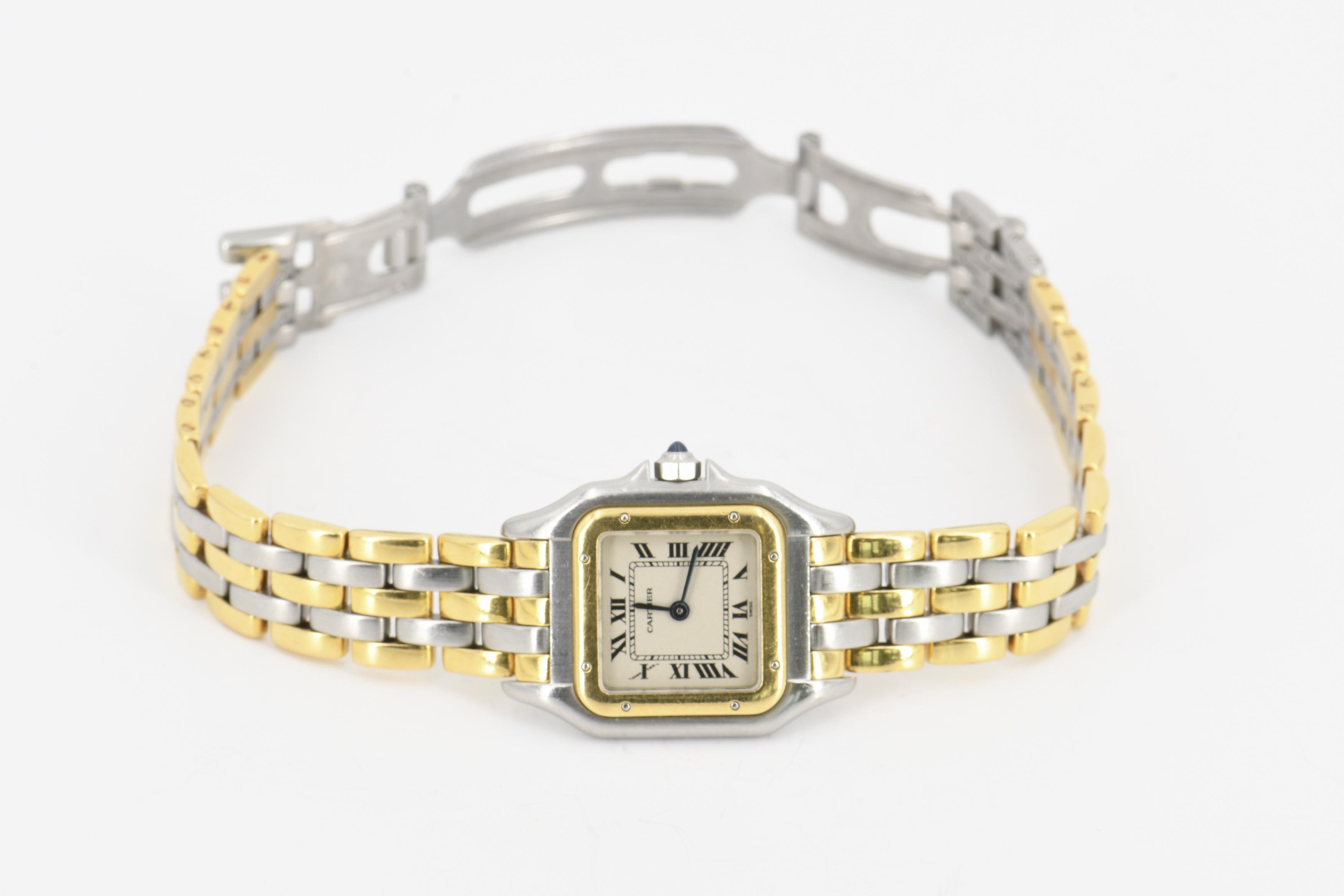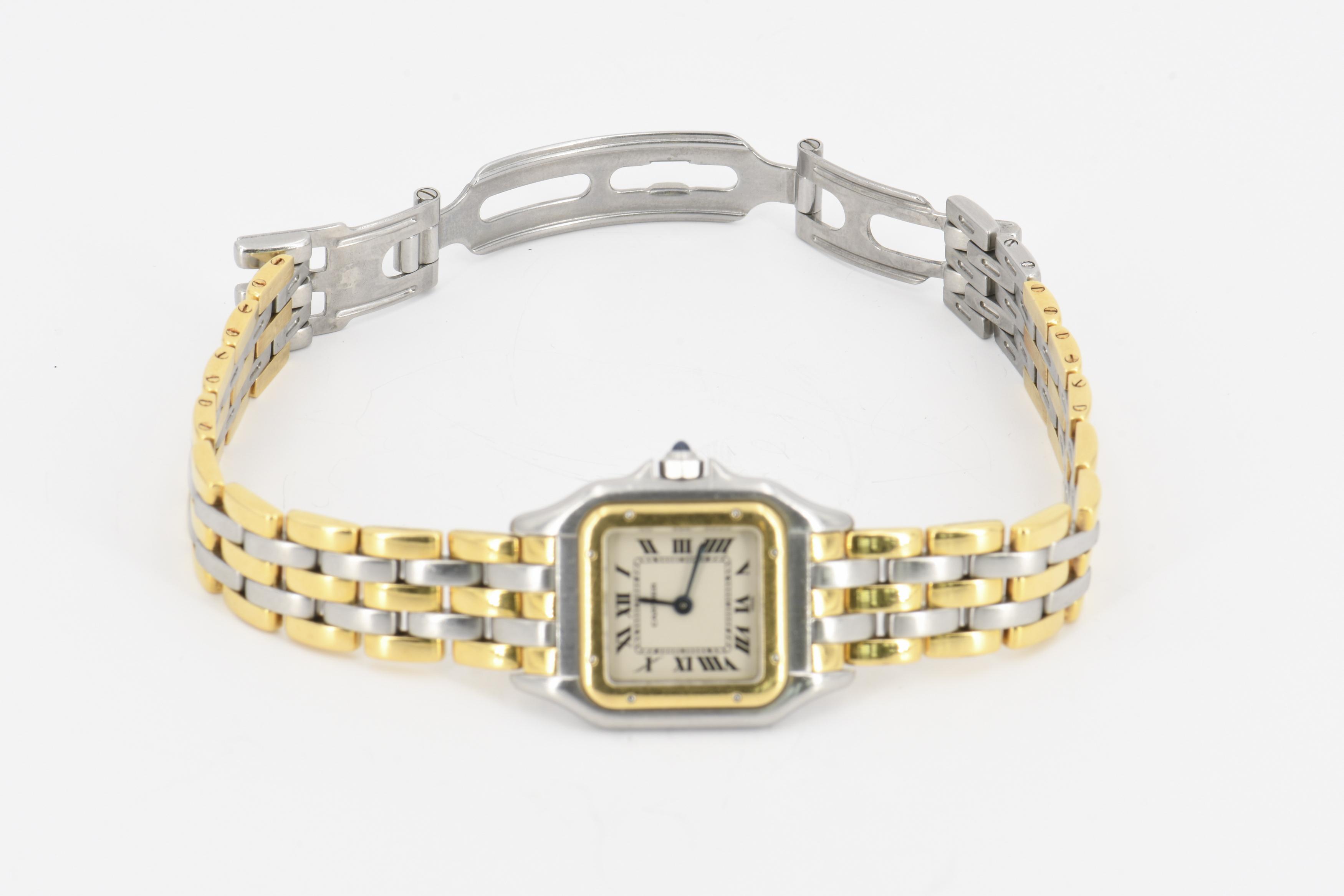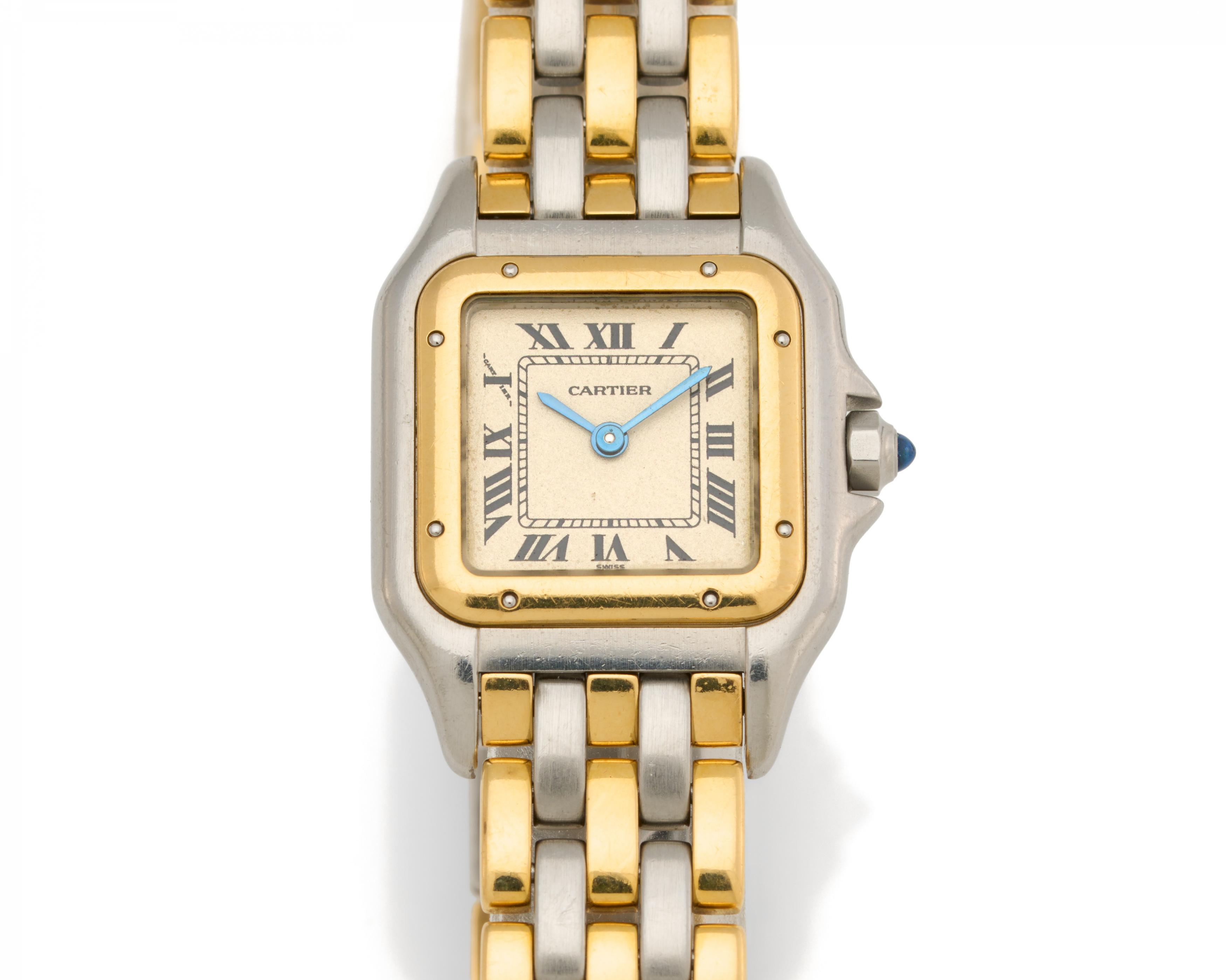 Gehäuse/Armband: 750/- Gelbgold, Stahl, Armband, Zffbl. creme lackiert, Zeiger gebläut, Indizes schwarz.