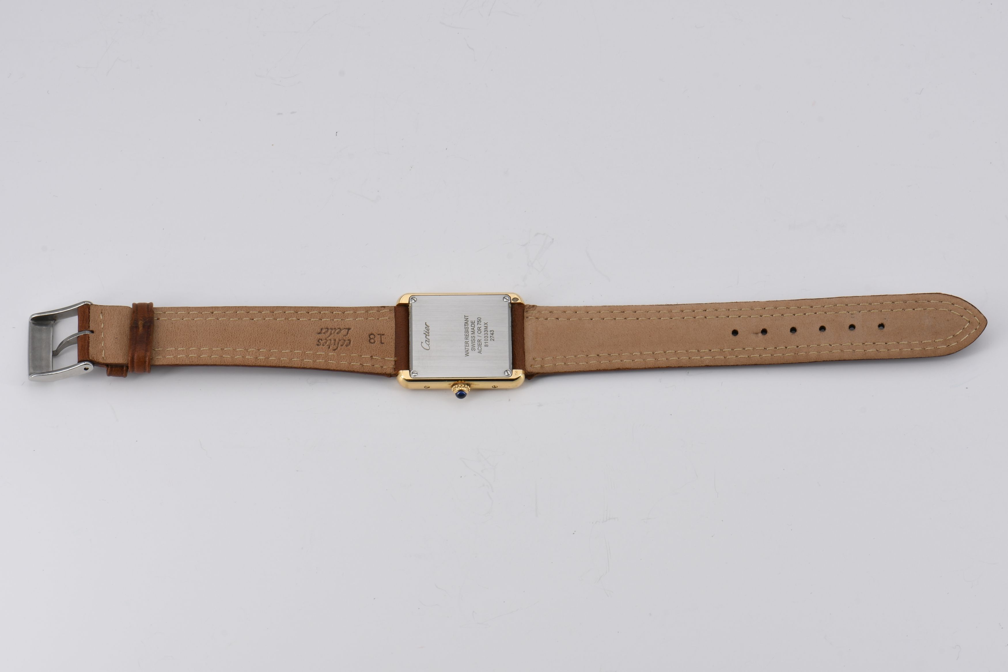 Gehäuse/Armband: 750/- Gelbgold, Lederarmband mit Dornschließe, Zffbl. silber/weiß lackiert mit röm. Indizes, Zeiger gebläut.
