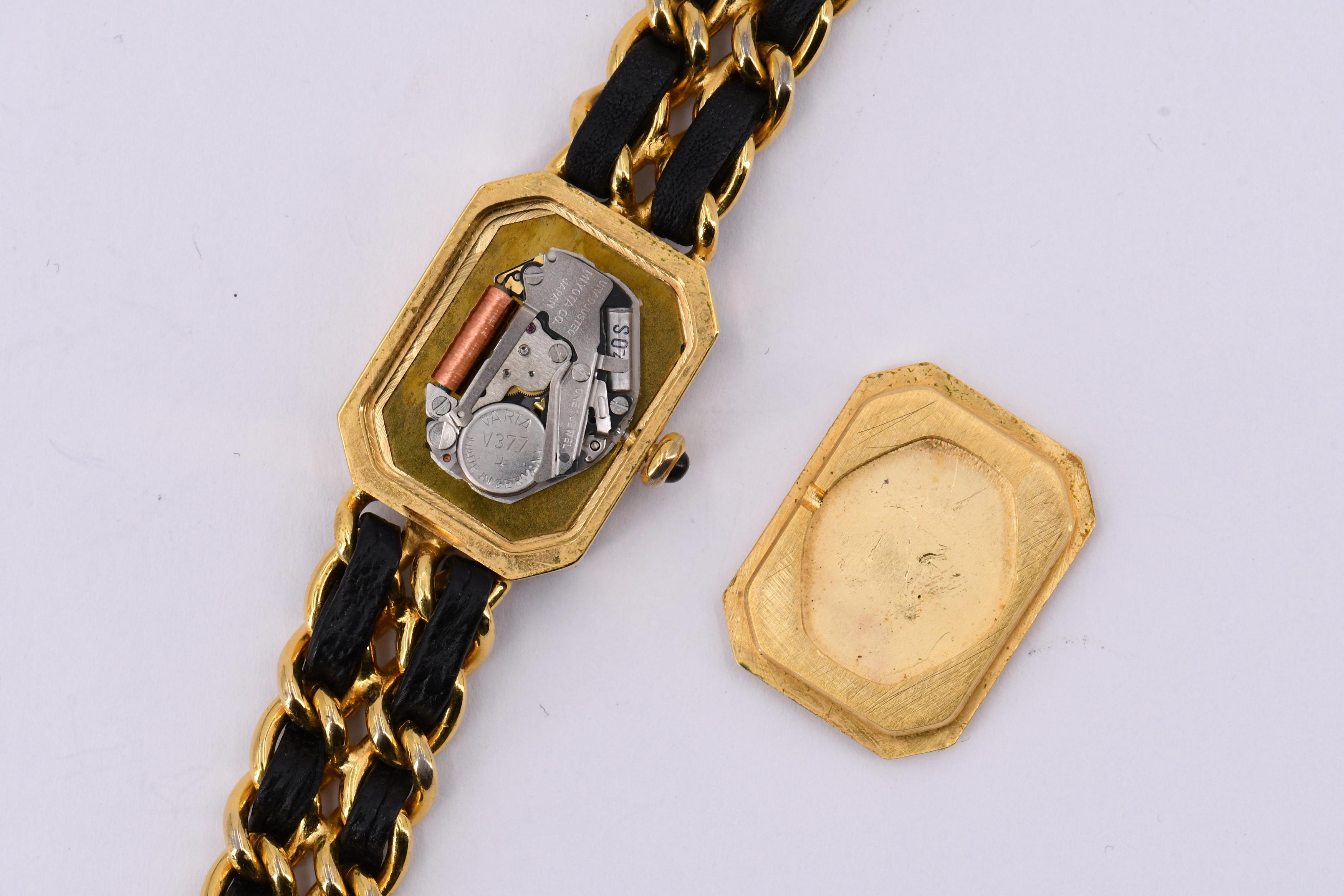 Gehäuse/Armband: Vergoldet 20 Mikron, Ledereinlage Zffbl. schwarz lackiert, goldefarbene Balkenzeiger.