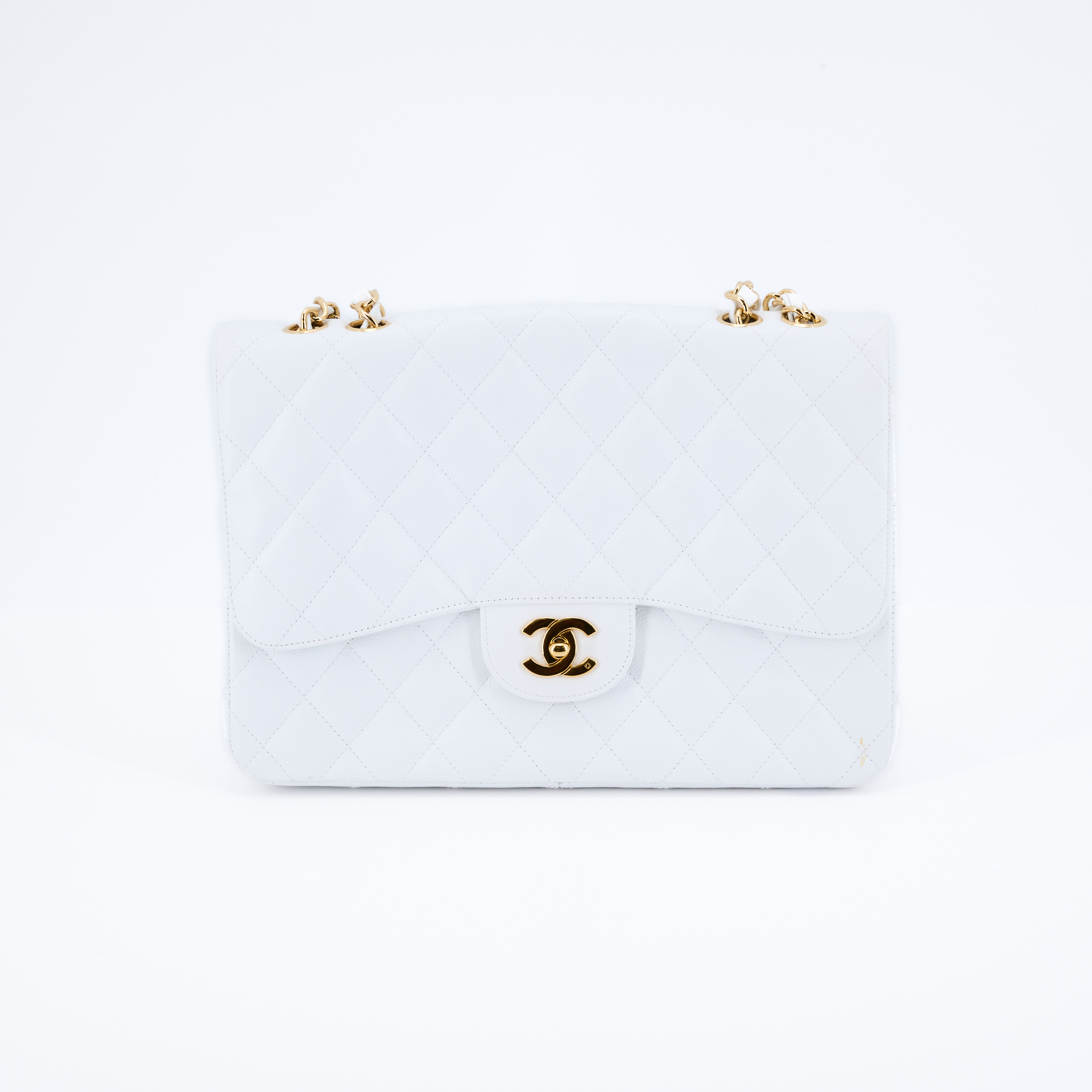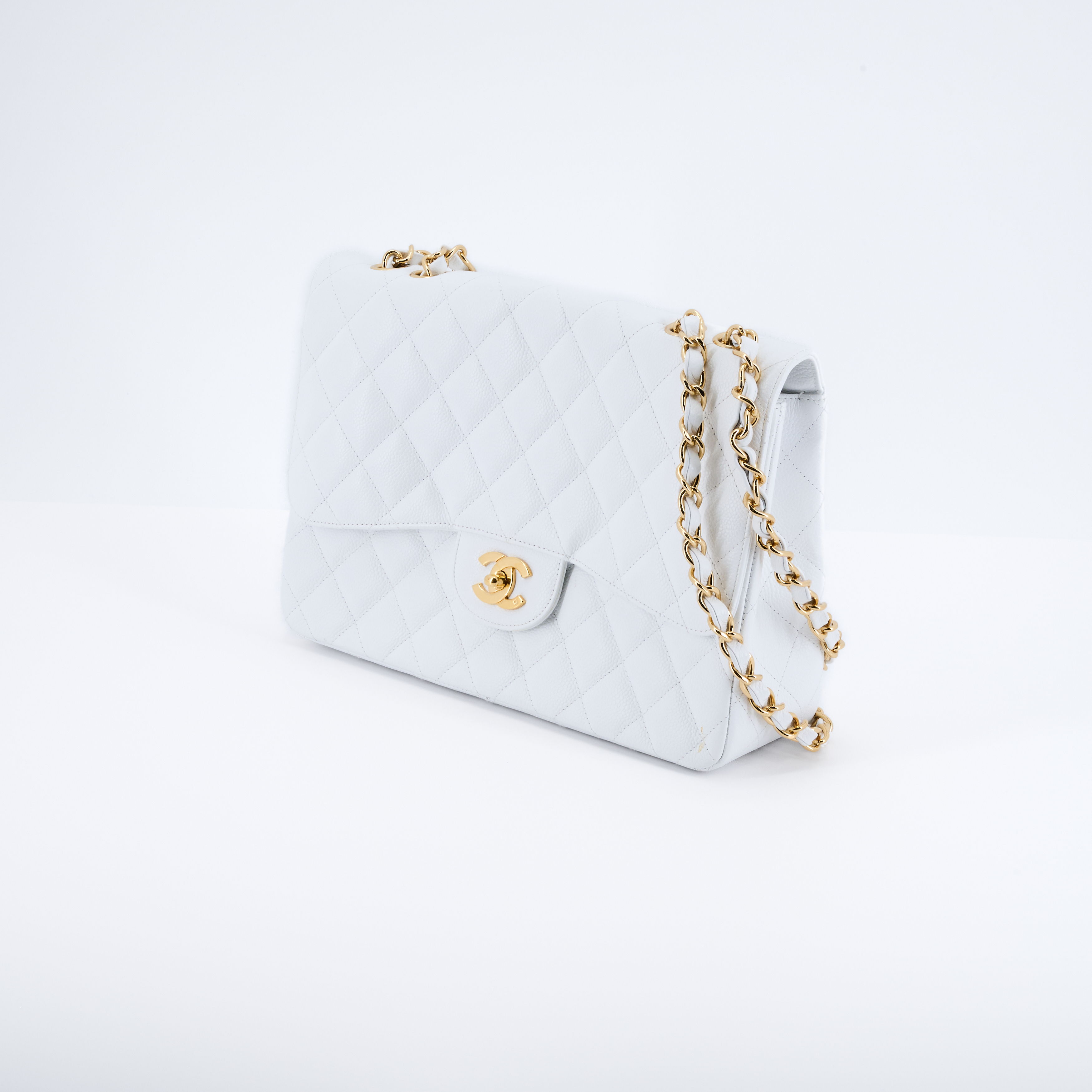 Material: Weiß, Kaviar-Leder, goldene Hardware.