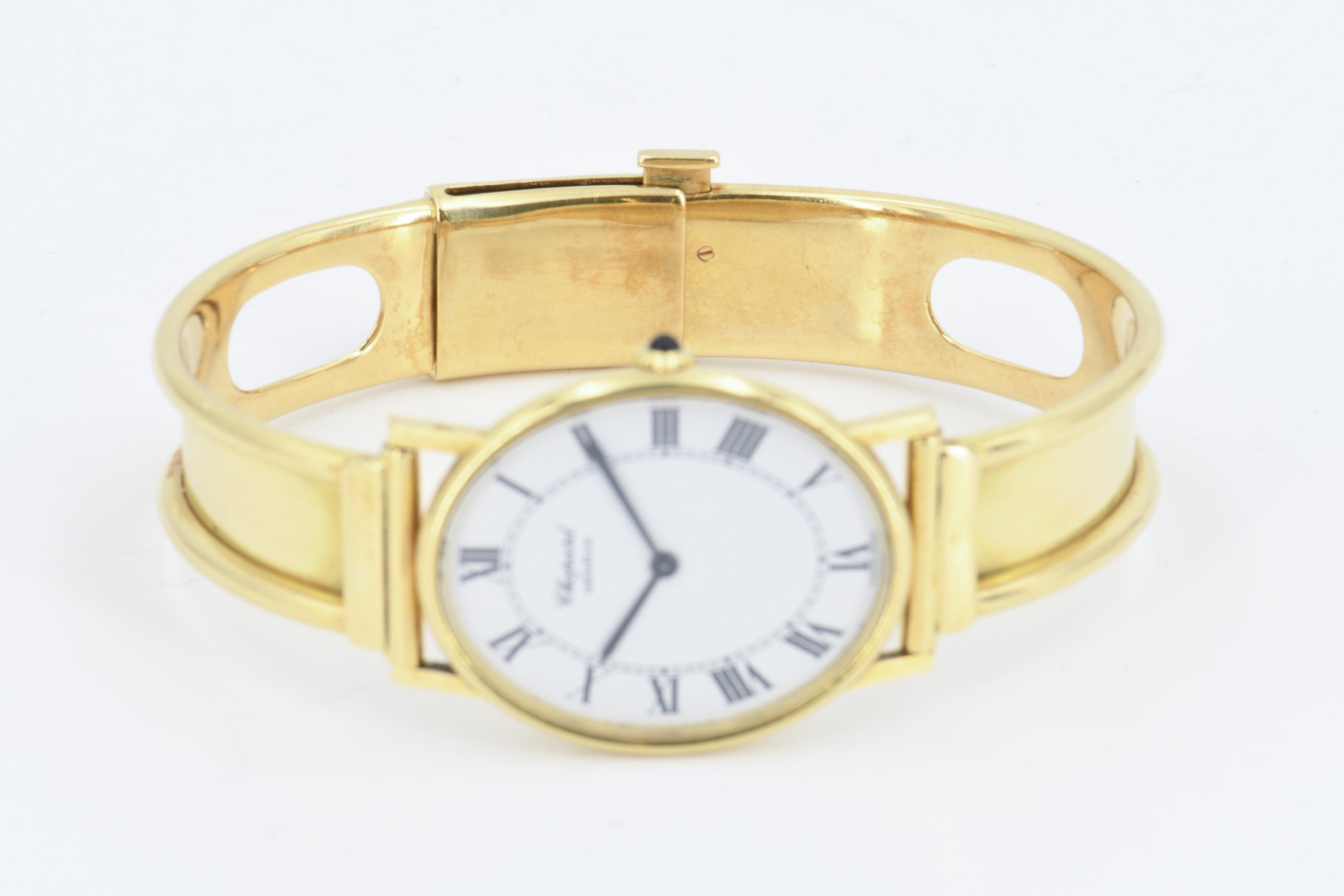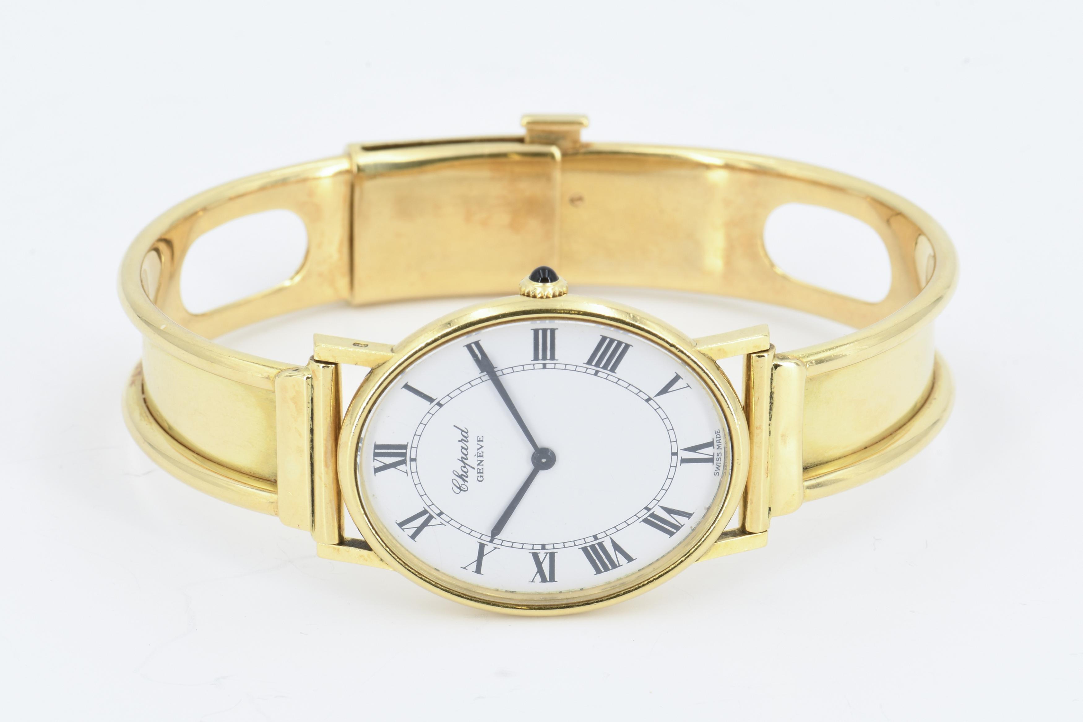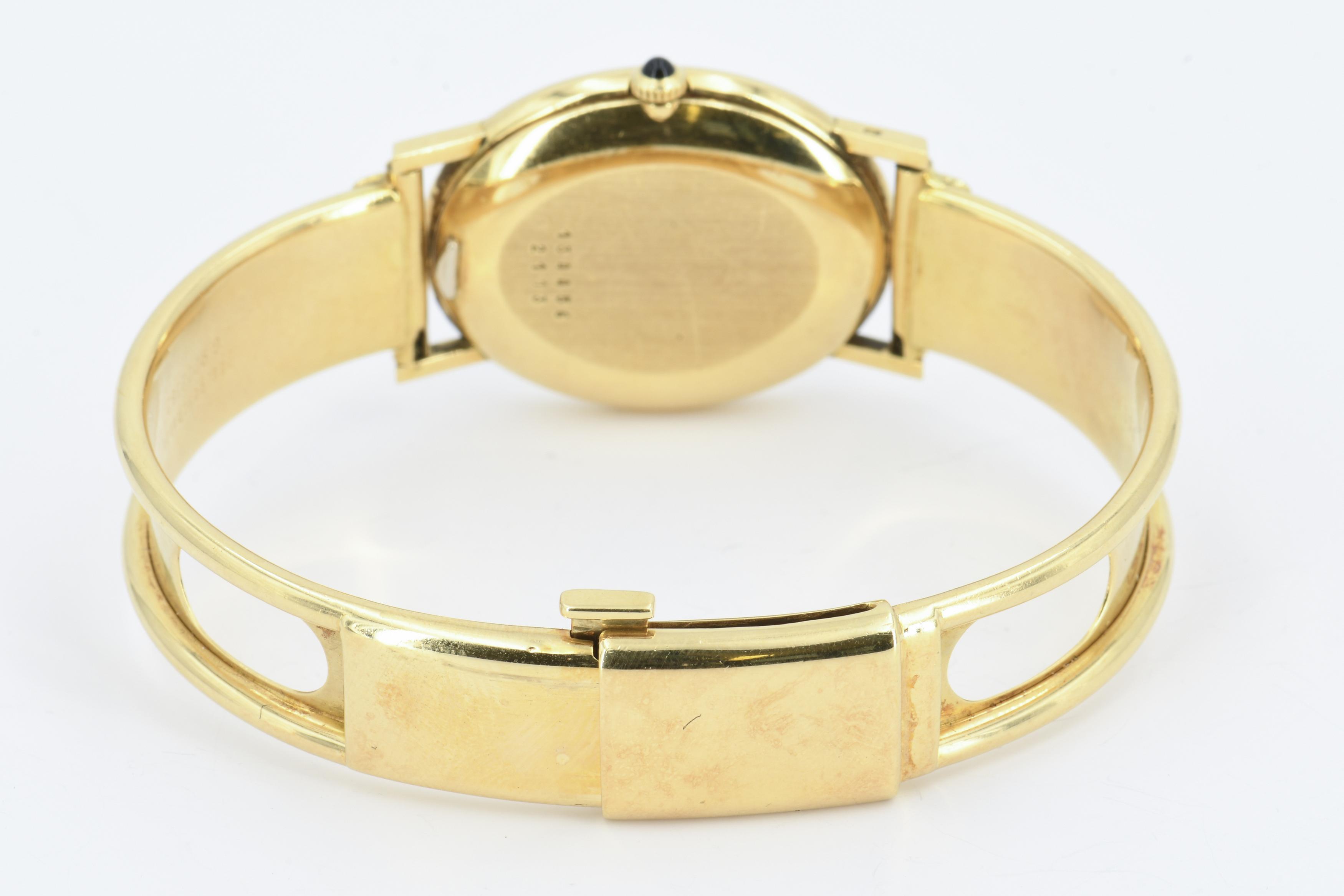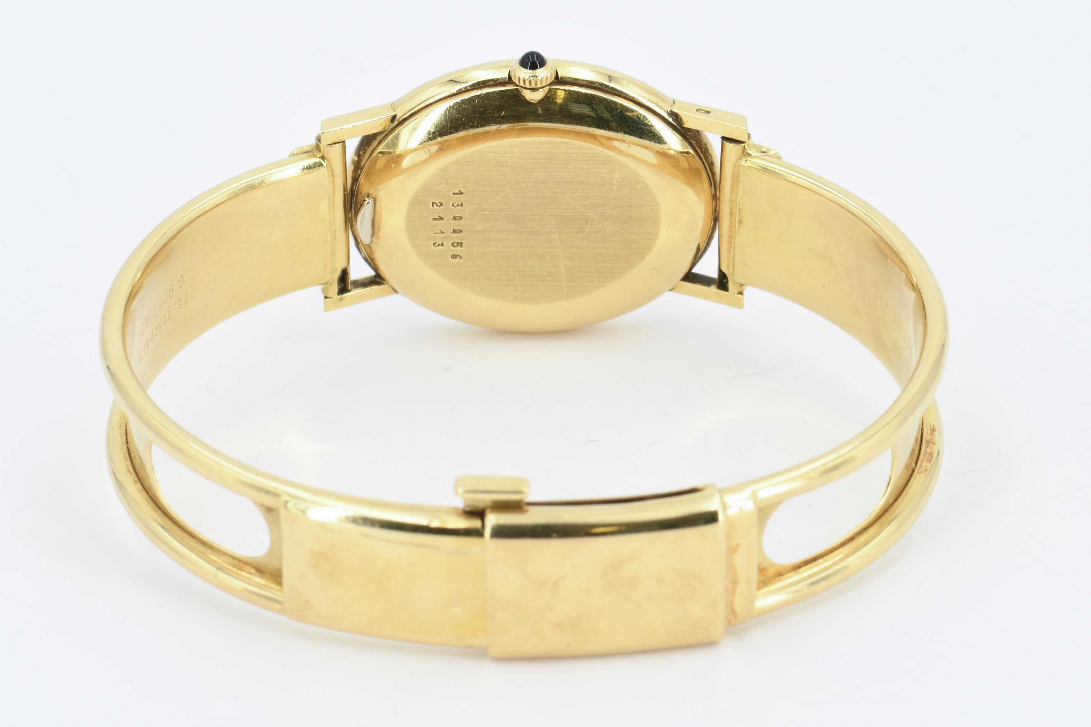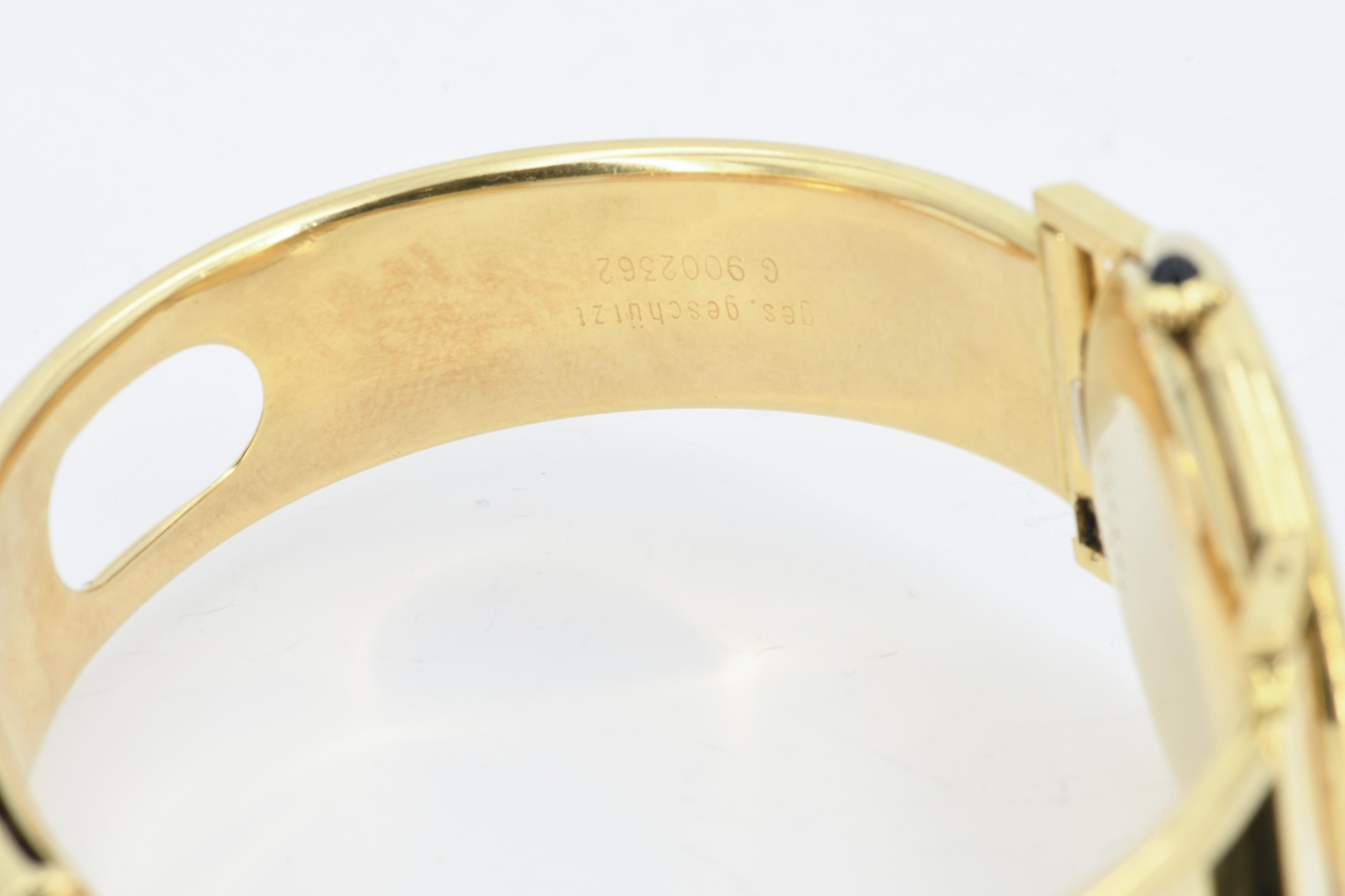 Gehäuse/Armband: 750/- Gelbgold, Goldarmspange nicht original, Zffbl. weiß, Zeiger/Indiezes schwarz.