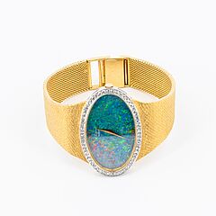 Gehäuse/Armband: 750/- Gelbgold, Diamant-Lünette besetzt mit 60 Diamanten im Achtkant-Schliff zus. ca. 0,6 ct., Milanaiseband mit Schließe, Zffbl. Opal, Zeiger golden.