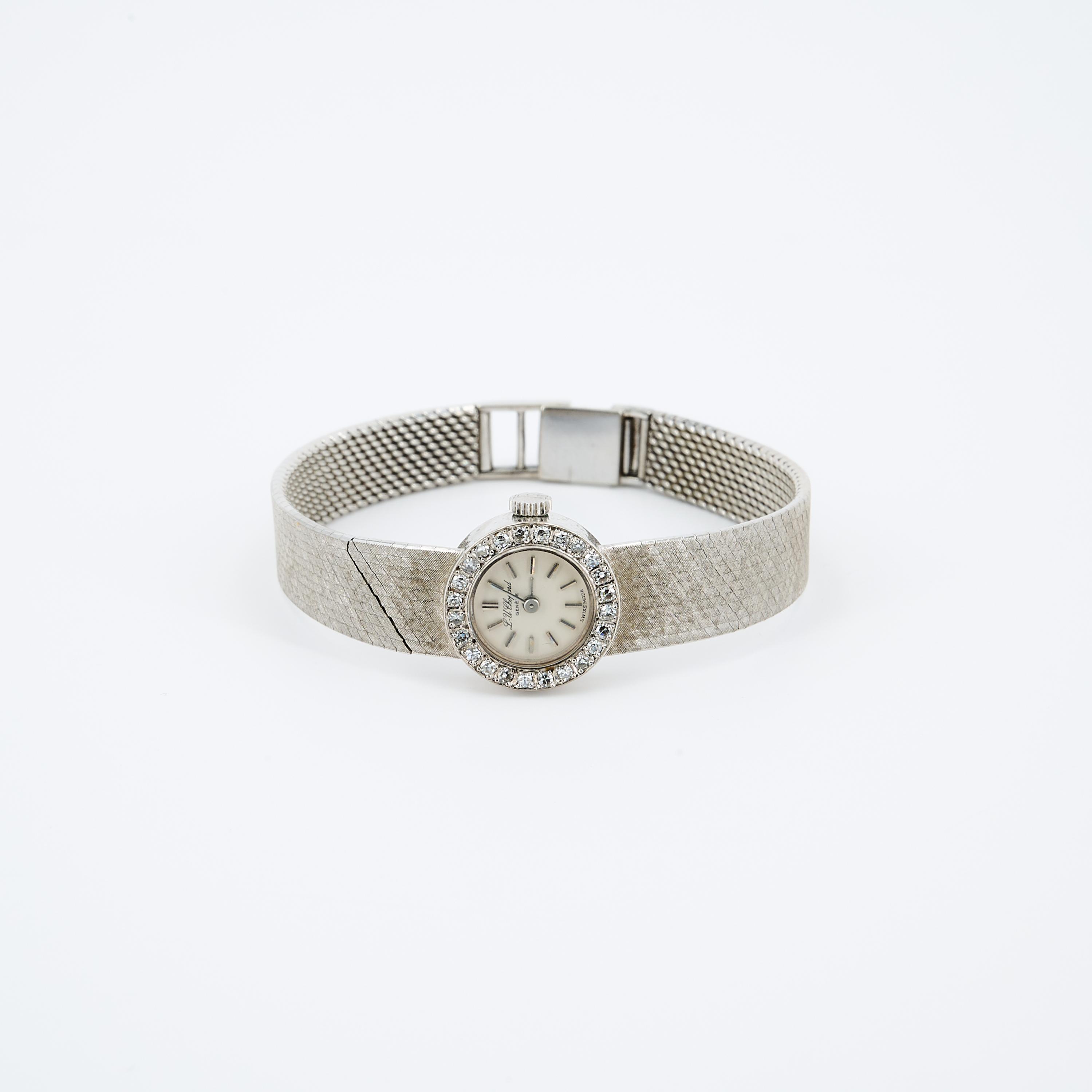Gehäuse/Armband: 750/- Weißgold mit Diamant-Lünette, 24 Diamanten im Achtkant-Schliff zus. ca. 0,36 ct., Milanaiseband mit Kastenschloss, Zffbl. silbern, Zeiger und Indizes silbern.