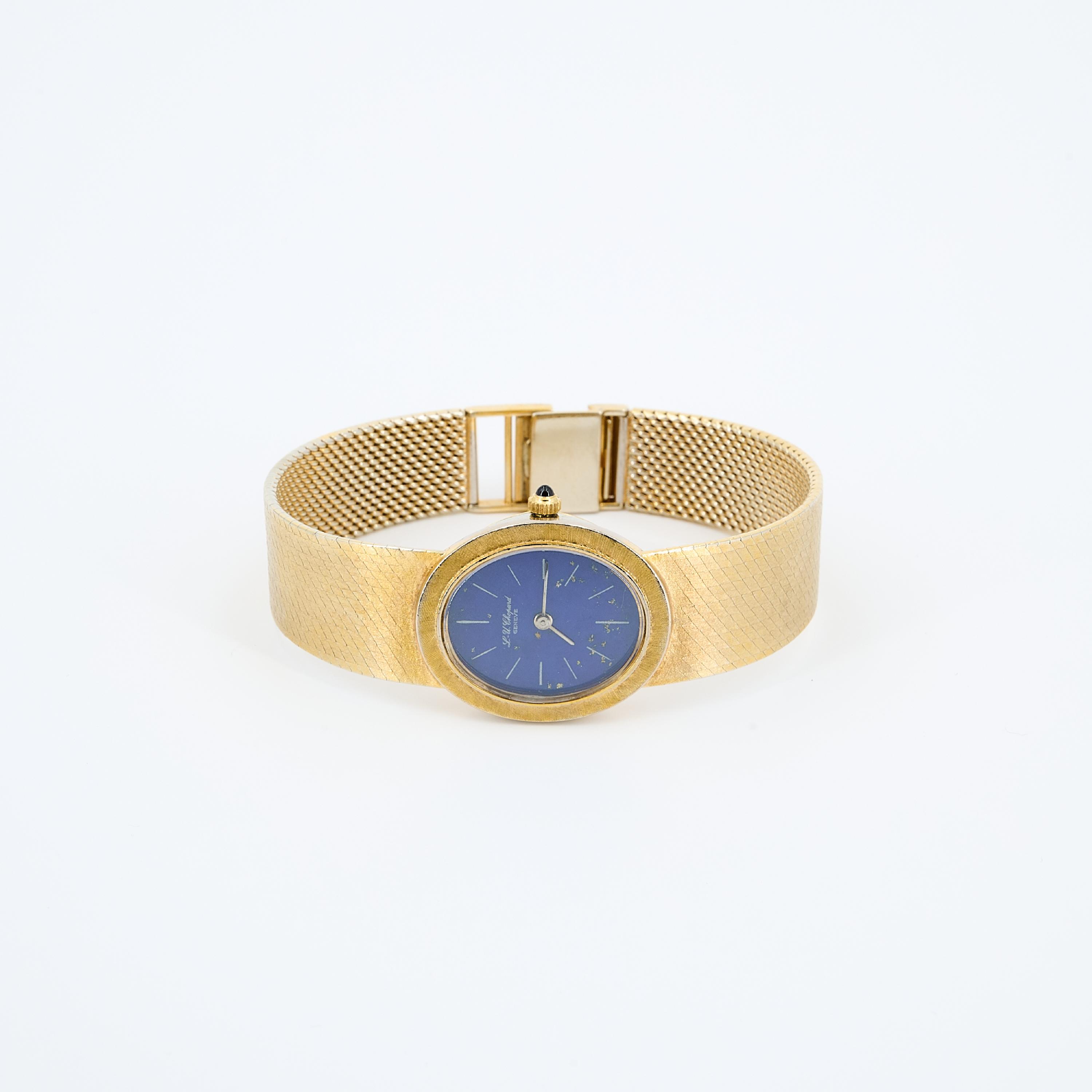 Gehäuse/Armband: 750/- Weißgold mit Gelbgoldüberzug, Milanaiseband mit Kastenschloß, Zffbl. blau, Zeiger und Indizes silbern.