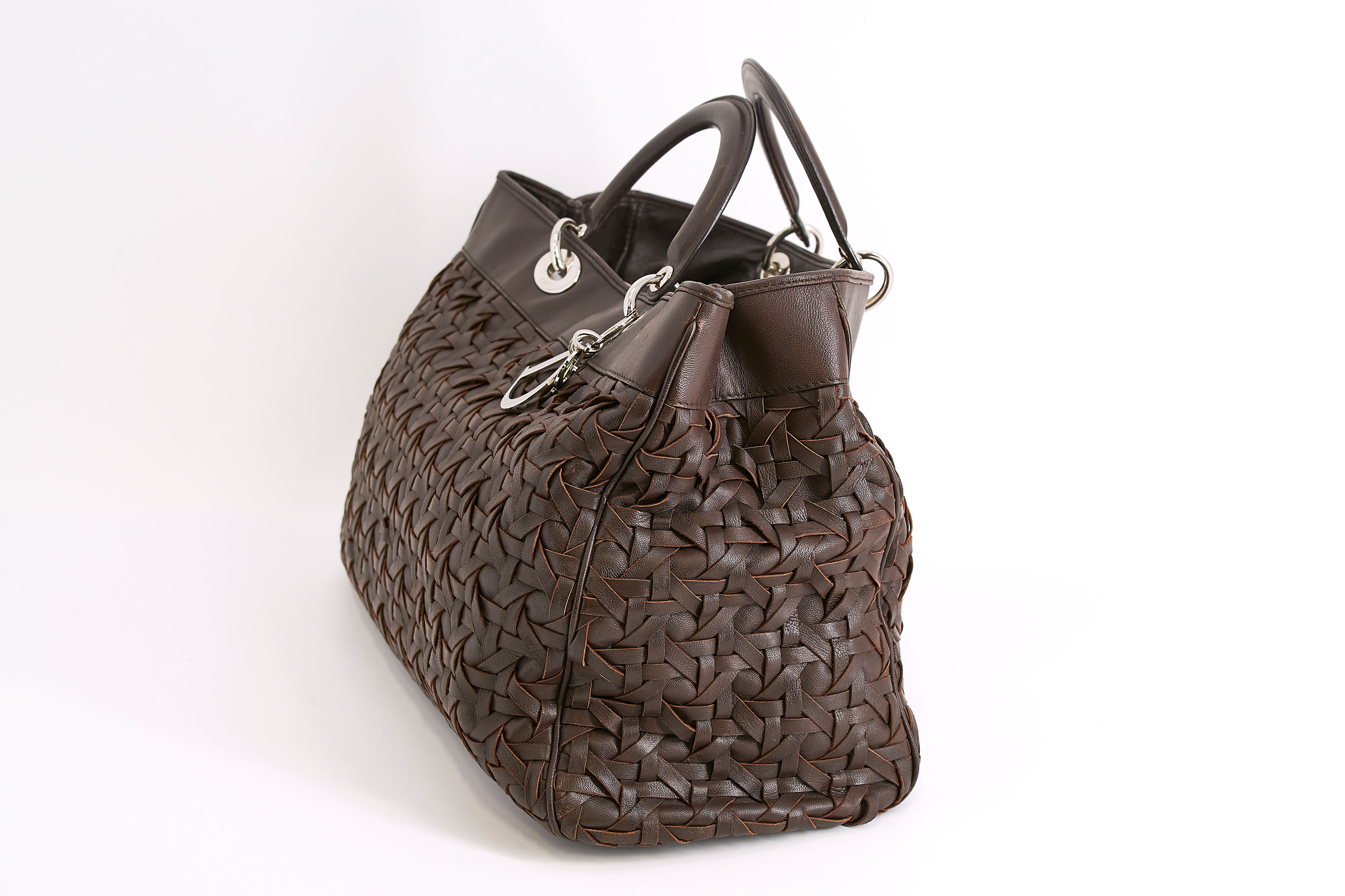 Beschreibung: Dunkelbraunes, geflochtenes Leder.