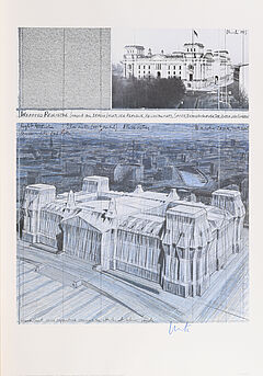 Wrapped Reichstag (Project for Berlin). 1993. Farboffset auf leichtem Karton. 78 x 61,5cm (100 x 70cm). Signiert. Schumacher Edition Fils, Düsseldorf (Hrsg.).