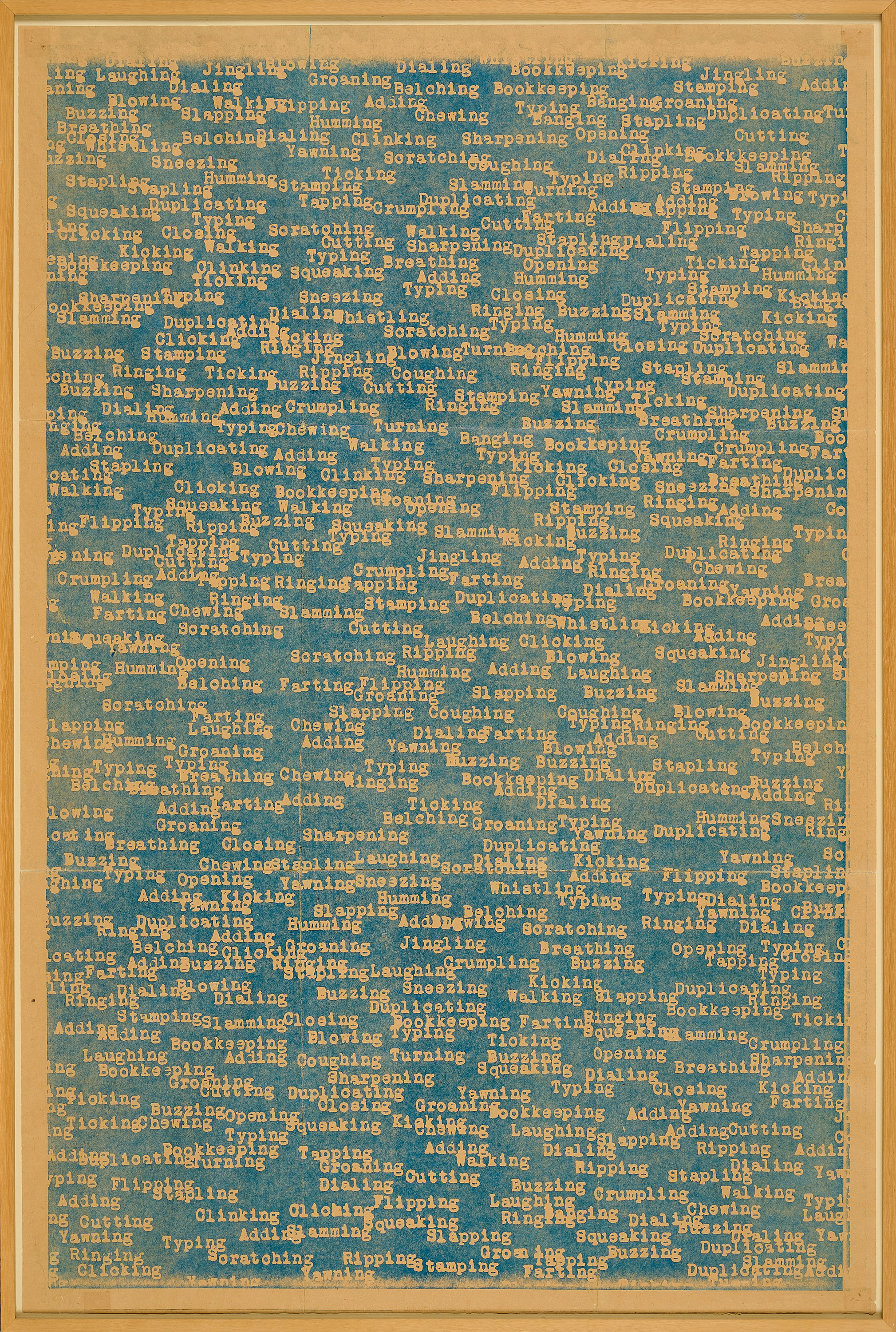 Dargestellt sind Laute, die man in einem Büro hören könnte. Außerhalb der eigentlichen Auflage von 50 signierten, datierten und nummerierten Exemplaren von 5 Steinen, die zusätzlich mit Künstlerstempeln versehen sind. Diese Auflage wurde herausgegeben vom Nova Scotia College of Art and Design, Halifax, wo die Arbeiten im Rahmen eines Workshops für Lithografie auch gedruckt wurden. Möglicherweise handelt es sich bei dem vorliegenden Blatt um einen einfarbigen Probedruck.