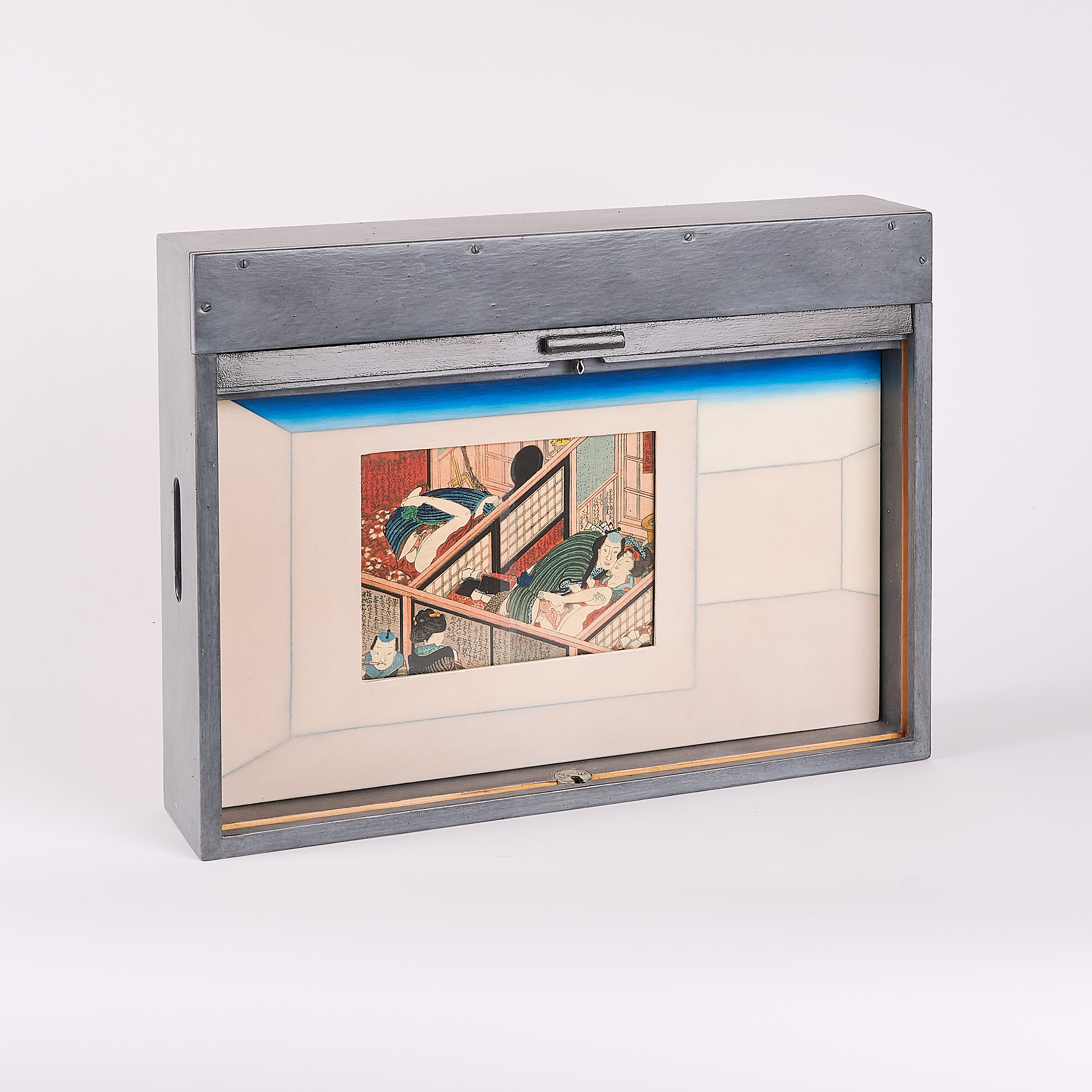 Technik: Leim und Pigmente auf Karton vor Glas vor japanischem Holzschnitt. In Holzkasten mit Rolltür.