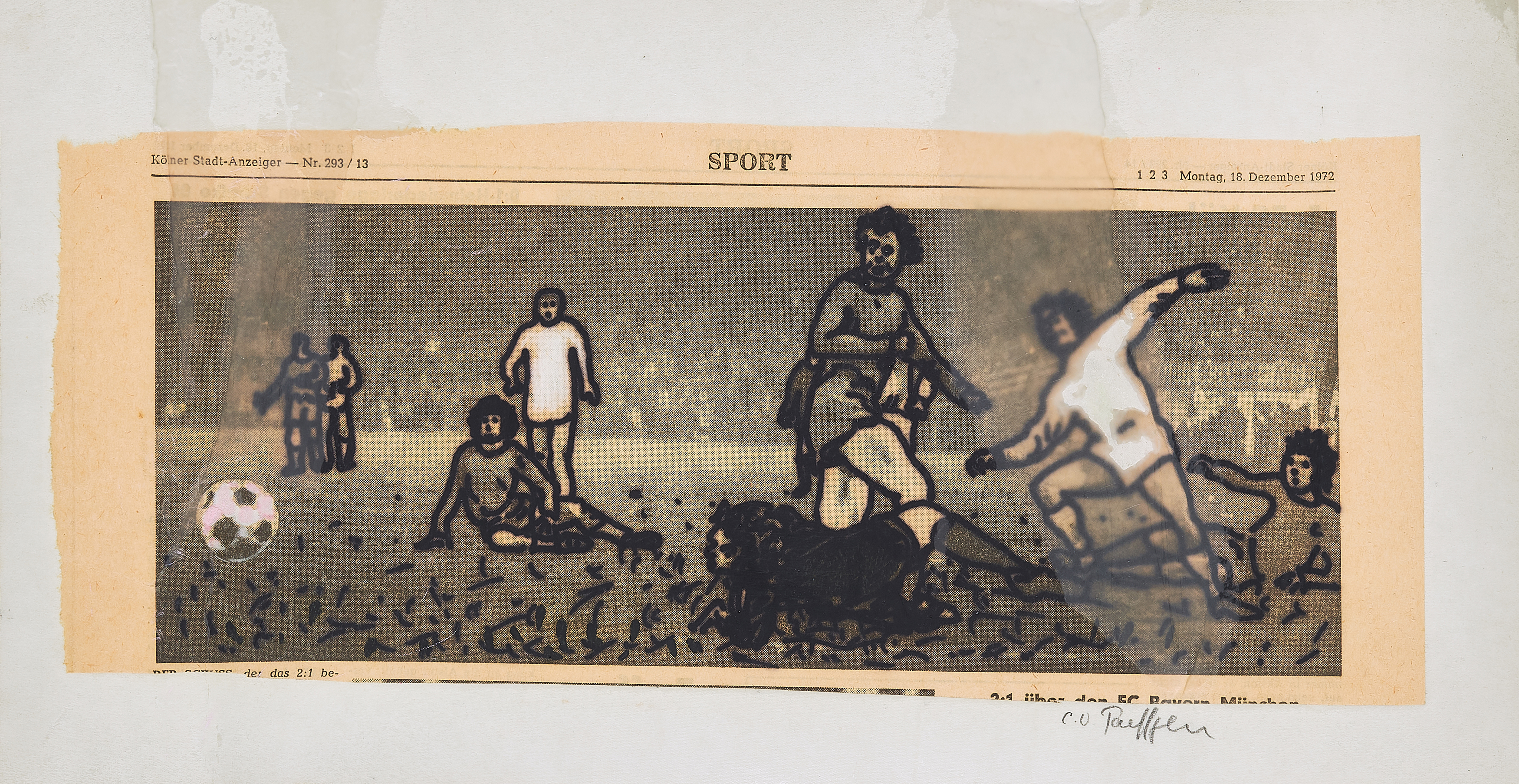 a) Ohne Titel (Fußball). Öl auf Folie über Filzstift auf Zeitungsseite. Auf Karton