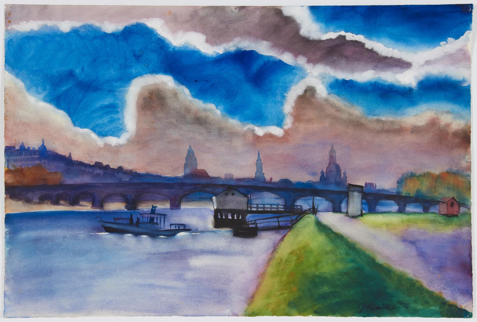 Bezeichnung: Signiert und datiert unten rechts: CFelixmüller Oktober 1951. Verso betitelt und bezeichnet: Conrad Felixmüller Aquarell "Dresden a d Elbe Blick auf die Albertbrücke u Stadt" 1931Gewitter über der Stadt.