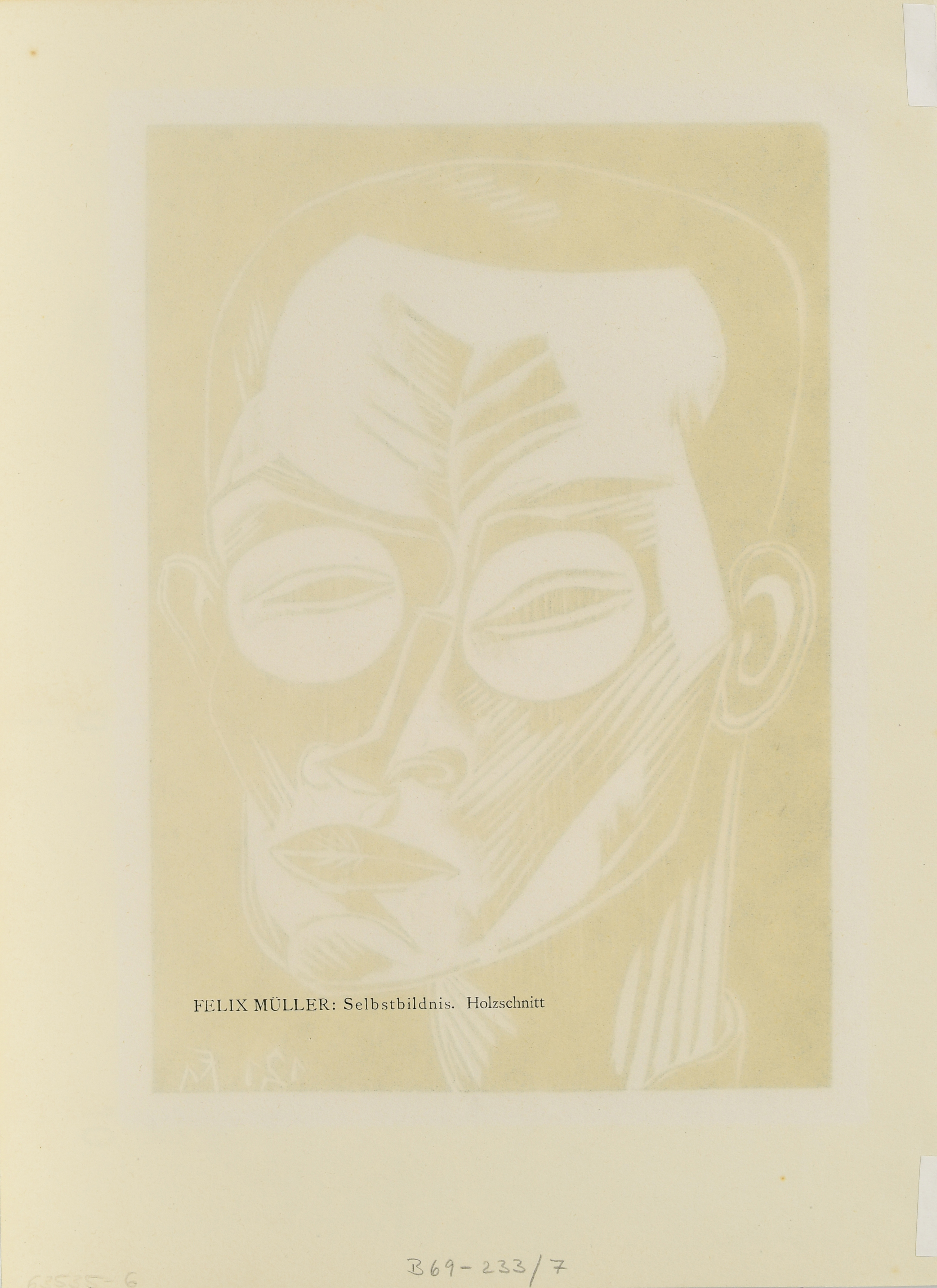 Selbstbildnis. 1920. Holzschnitt auf Velin. 24 x 17cm (32 x 24cm). Signiert, datiert und bezeichnet. Im Stock mit FM 121 bezeichnet. Verlag Klinkhardt & Biermann, Leipzig (Hrsg.).
