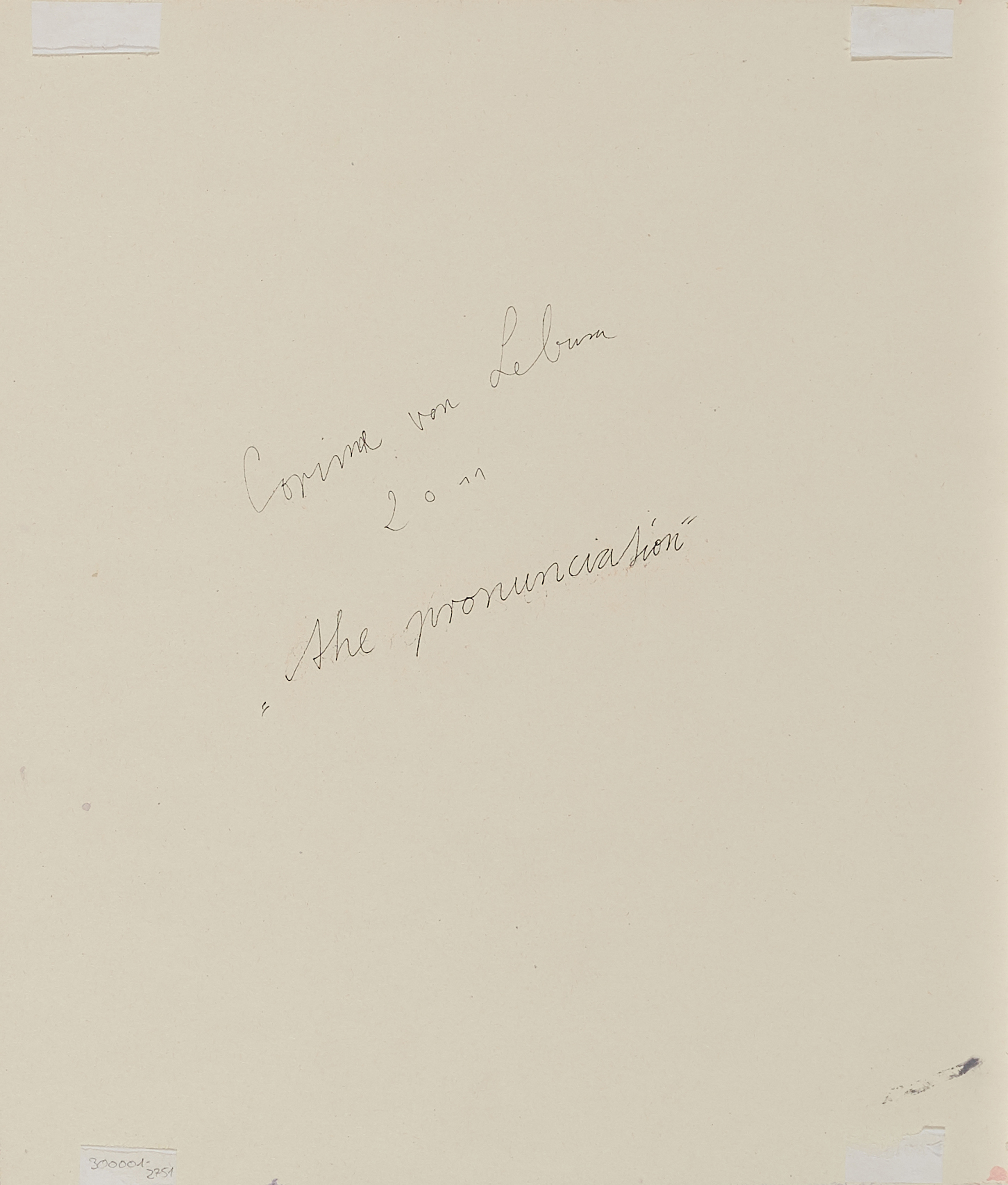 "the pronunciation". 2011. Mischtechnik auf Maltafel. 35 x 30cm. Signiert und datiert unten rechts: Lebusa 2011. Sowie signiert, datiert und betitelt verso: Corinne von Lebusa 2011 "the pronunciation".