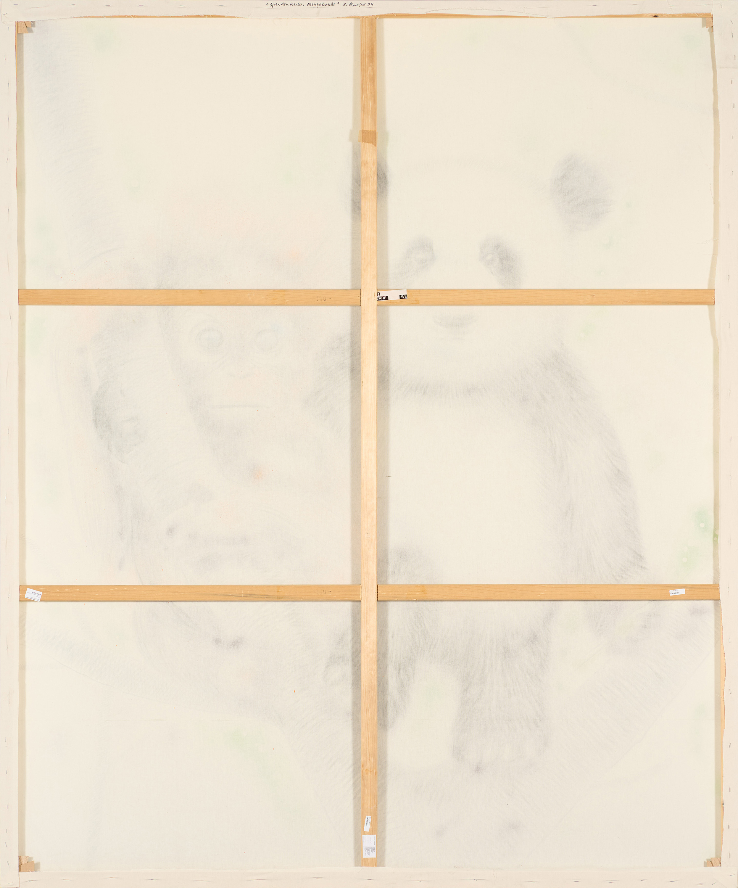 Leicht geringe Leinwandspannung, daher drückt sich der Keilrahmen leicht durch. Vereinzelt minimale Verschmutzungen an den Kanten. Ansonsten sehr guter Zustand.