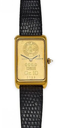 Damenuhr. Quartz. 750/- Gelbgold, Lederband schwarz, Dornschließe golden, 999,9/- Goldbarren-Zffbl. 10g, Zeiger schwarz. Gesamtgewicht: 39,0g. L.ca. 22,0cm, D.ca. 2,0 x 3,3cm.