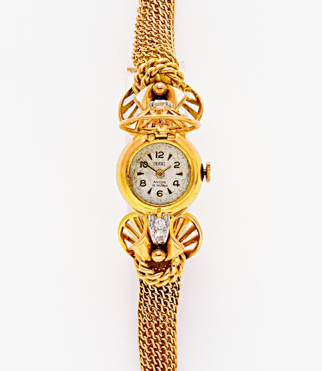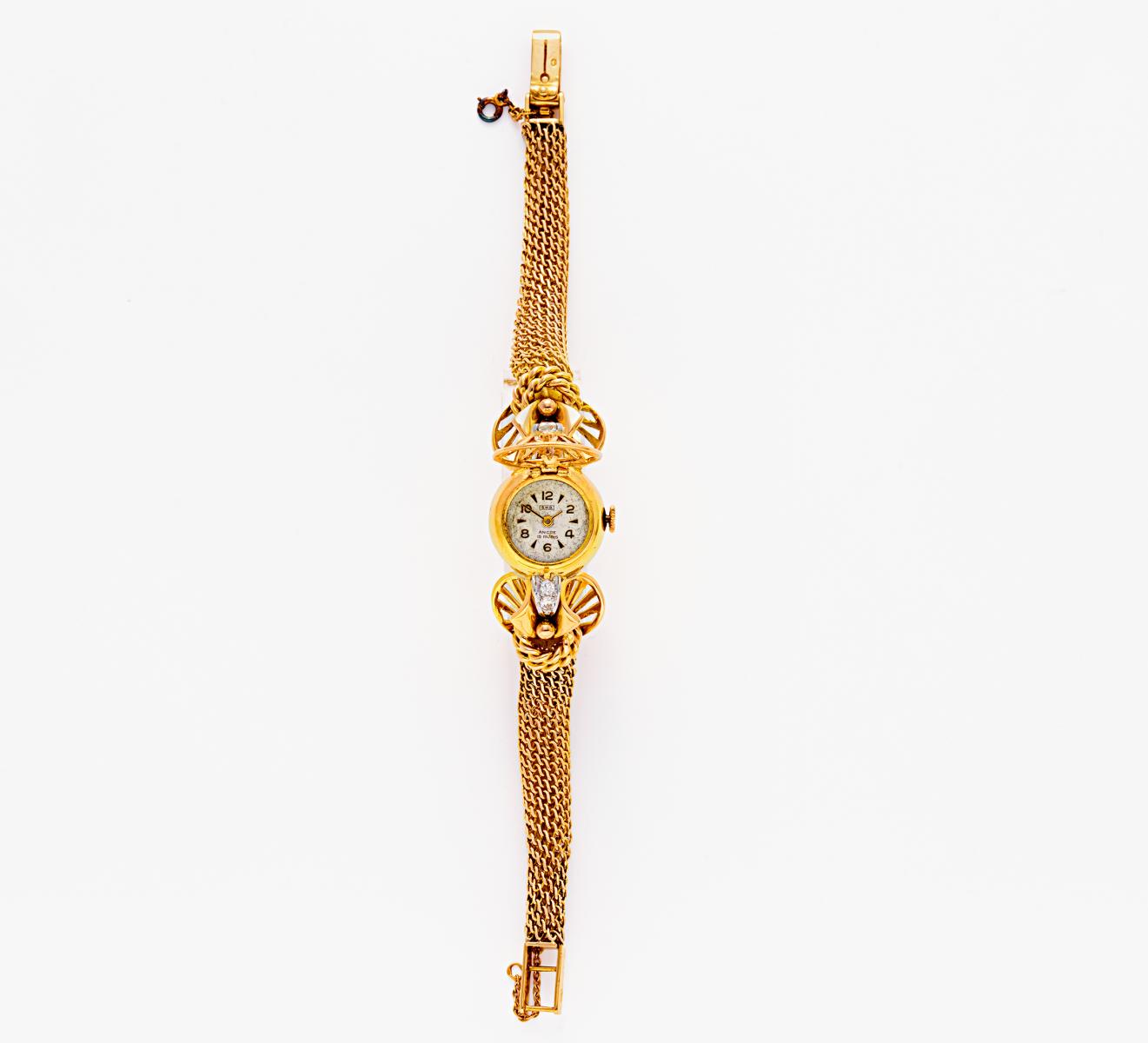 Gehäuse/Armband: 750/- Gelb-/Rotgold, gest., diamantgeziert, Zffbl. creme, Zeiger/Indizes golden.