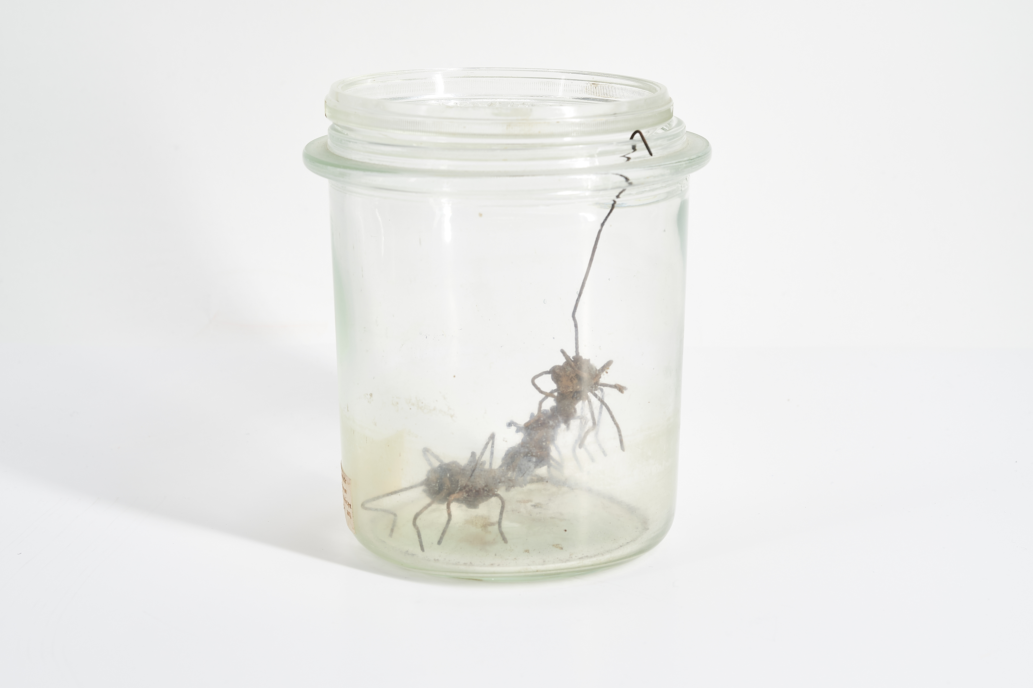 Am Glas ist ein Etikett befestigt mit von der Künstlerin handgeschriebenen pseudo-biologischen Angaben.