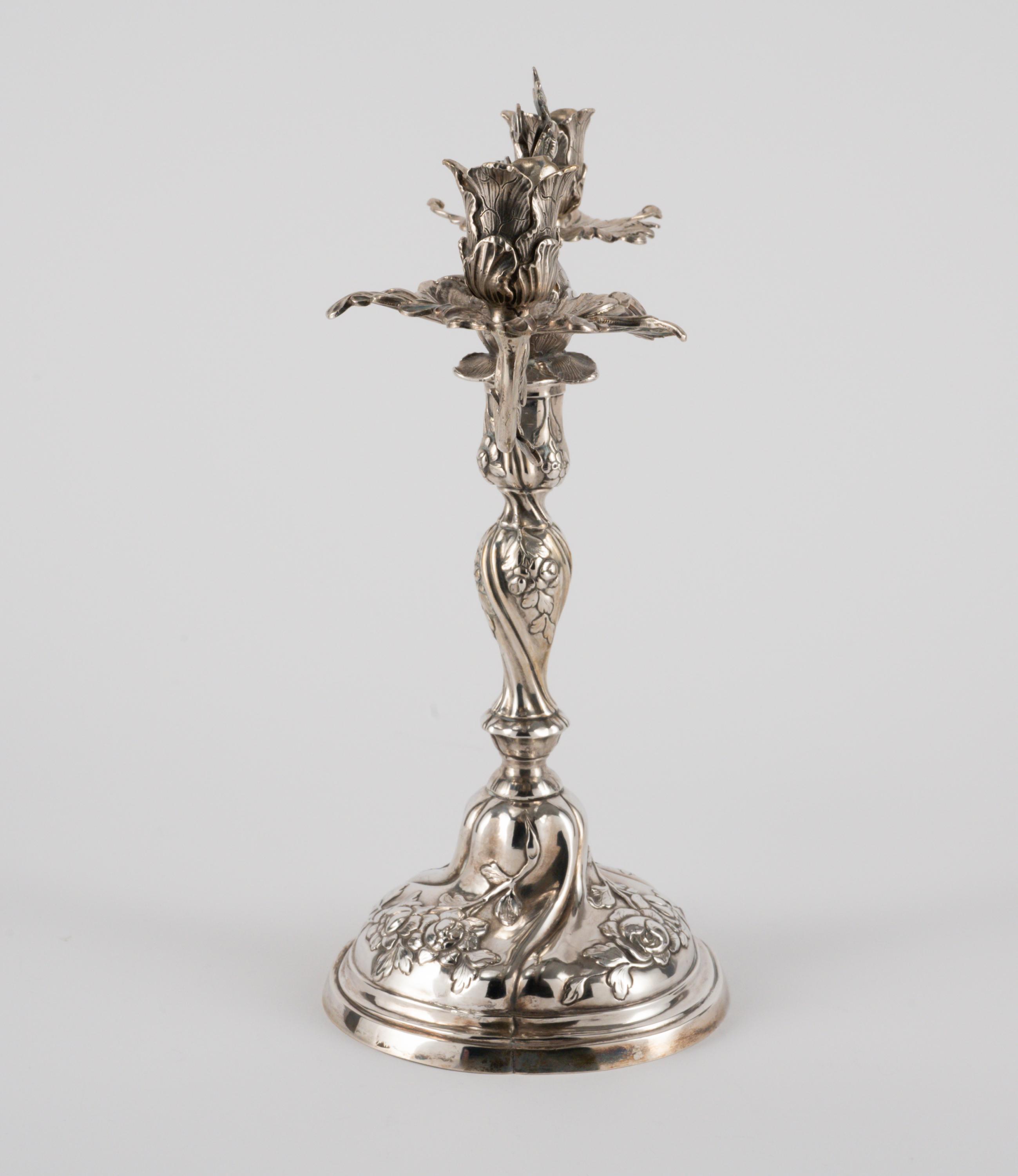 Balusterschaft mit reliefierten Rosen. Der zweiflammige Aufsatz mit Rankenrahmen und