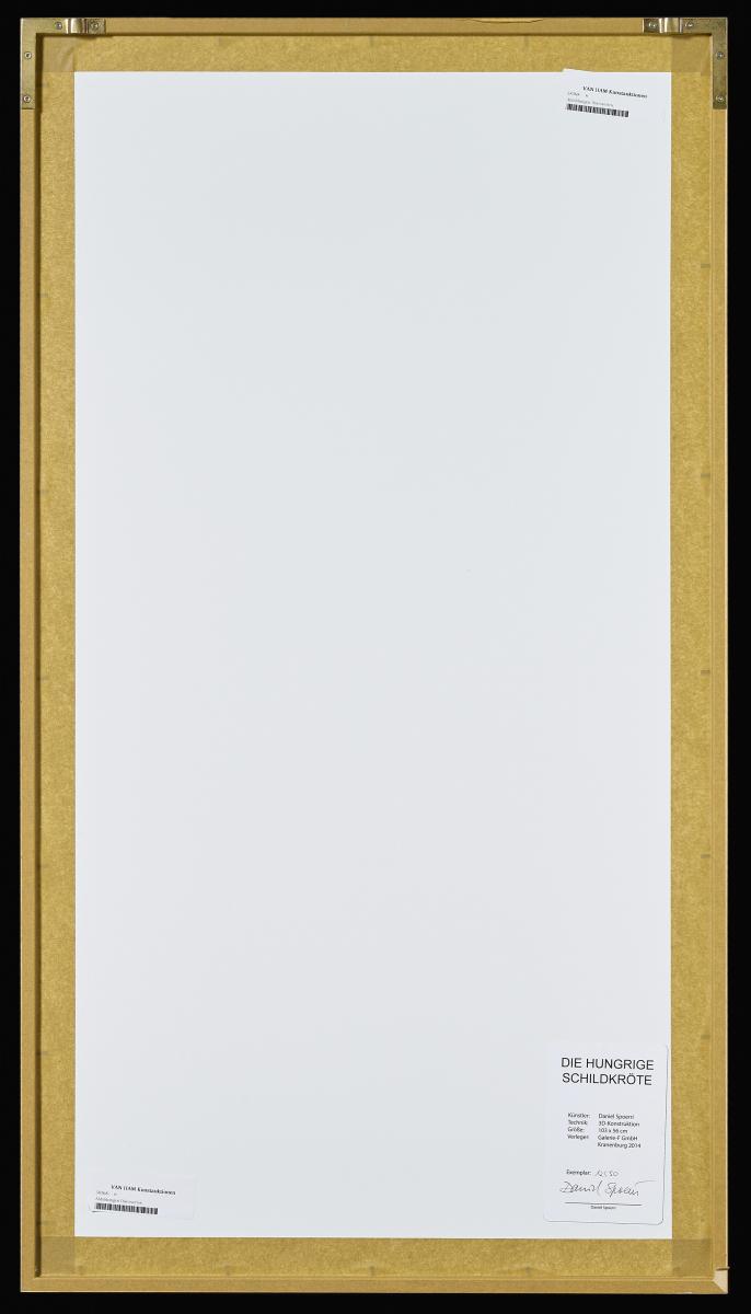 Die hungrige Schildkröte. Fallenbild. 2014. Bedrucktes Acrylglas über 3D-Konstruktion (Farbglicée auf Karton). 103 x 56 x 3cm. Nummeriert und signiert verso auf Aufkleber: 12/50 Daniel Spoerri. Edition Galerie F, Kranenburg (Hrsg.). Ex. 12/50. Kastenrahmen.