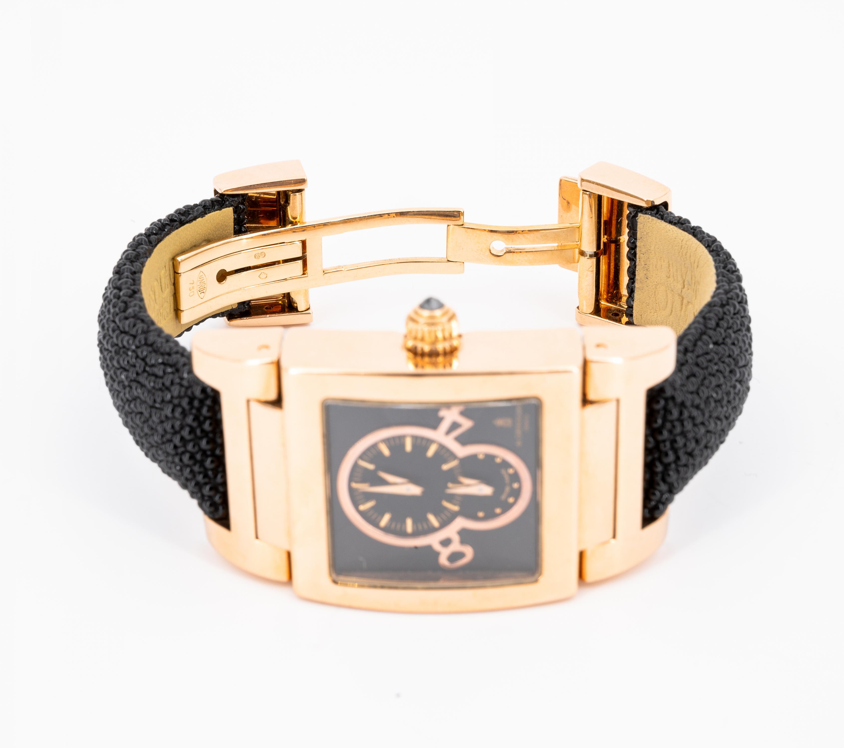 Gehäuse/Armband: 750/- Roségold, Rochenlederarmband mit Doppelfaltschließe, Zffbl. schwarz, Zeiger und Indizes roségolden.