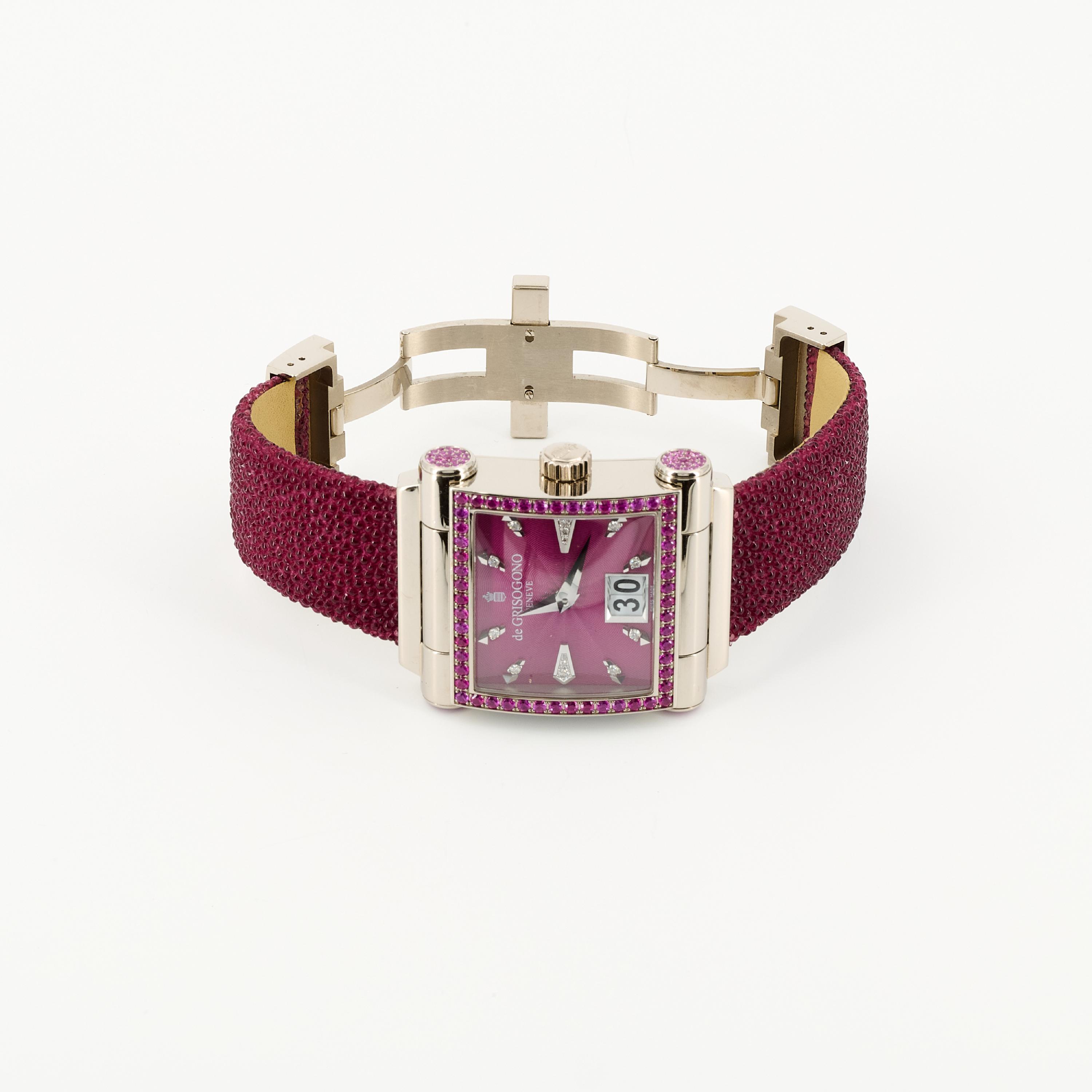Gehäuse/Armband: 750/- Weißgold besetzt mit 190 Rubinen zus. ca. 3,5 ct., Rochenlederarmband mit Doppelfaltschließe, Zffbl. pink, Zeiger silbern, Indizes silbern mit Diamanten.