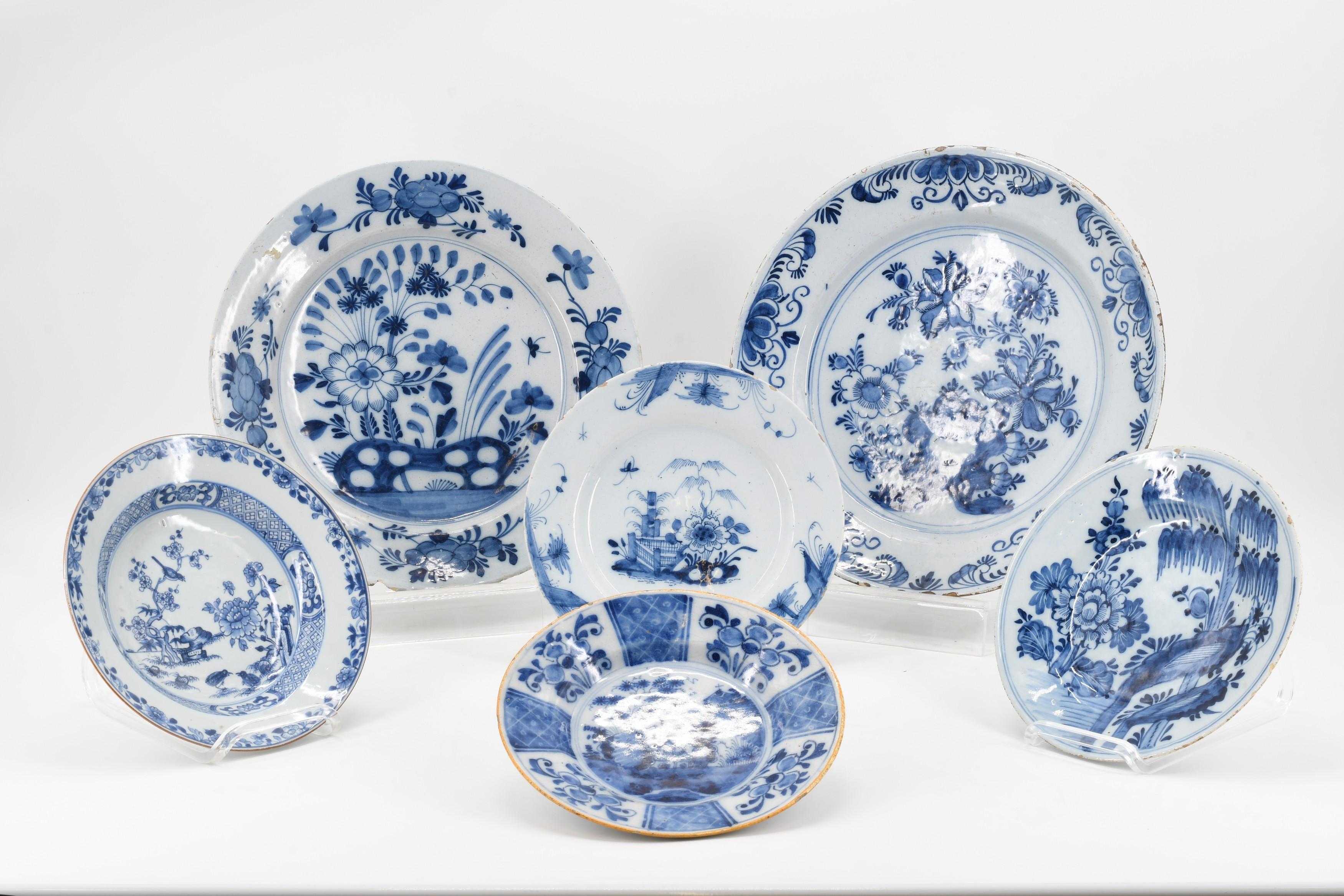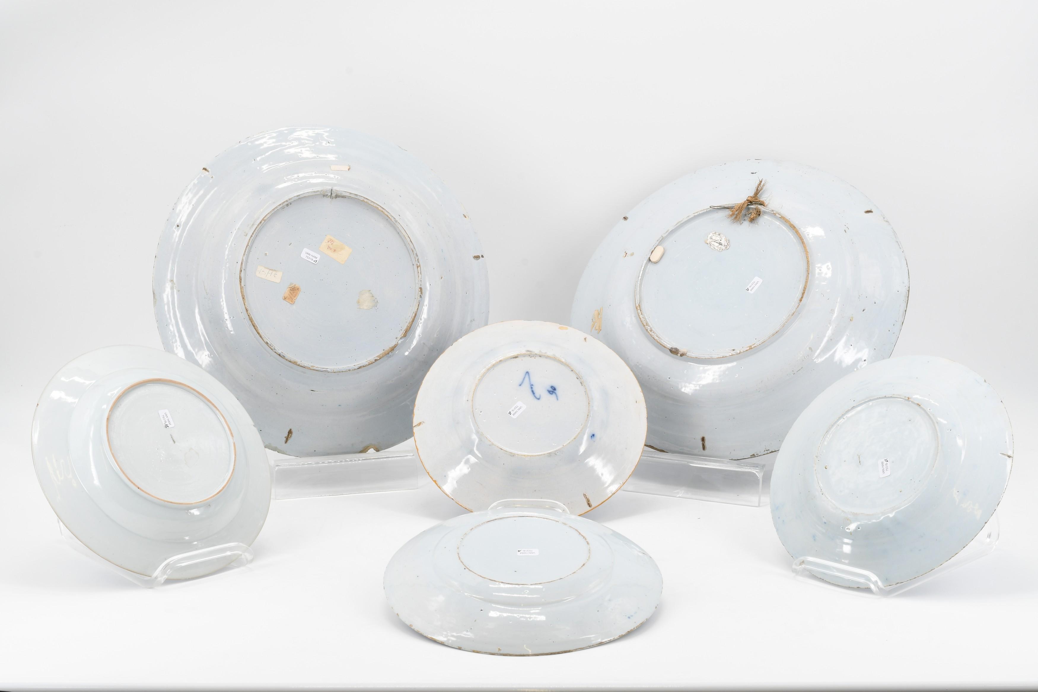 Technik: Fayence mit lichtblauer Glasur und dunkelblauem Dekor bzw. mit polychromem Dekor.