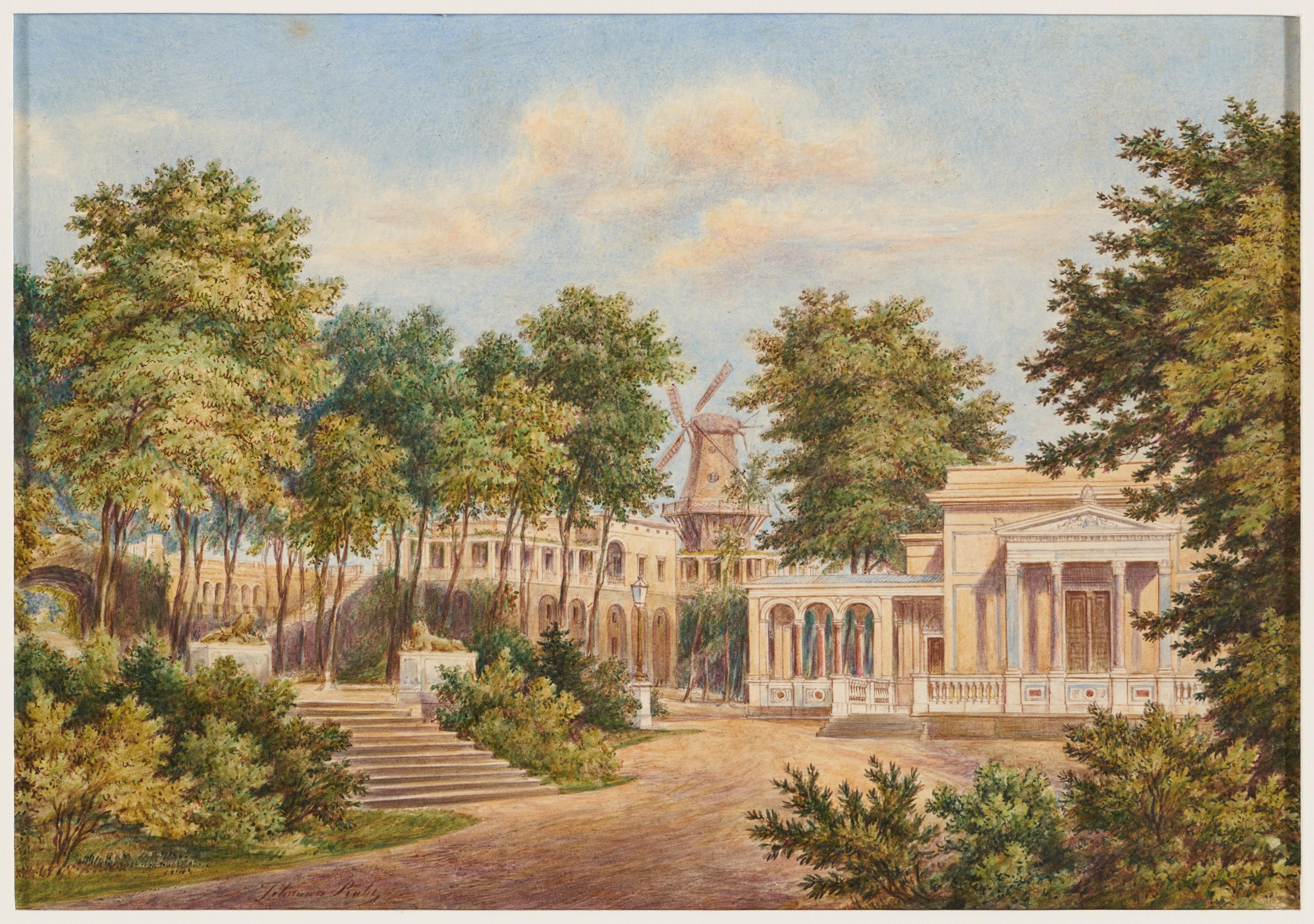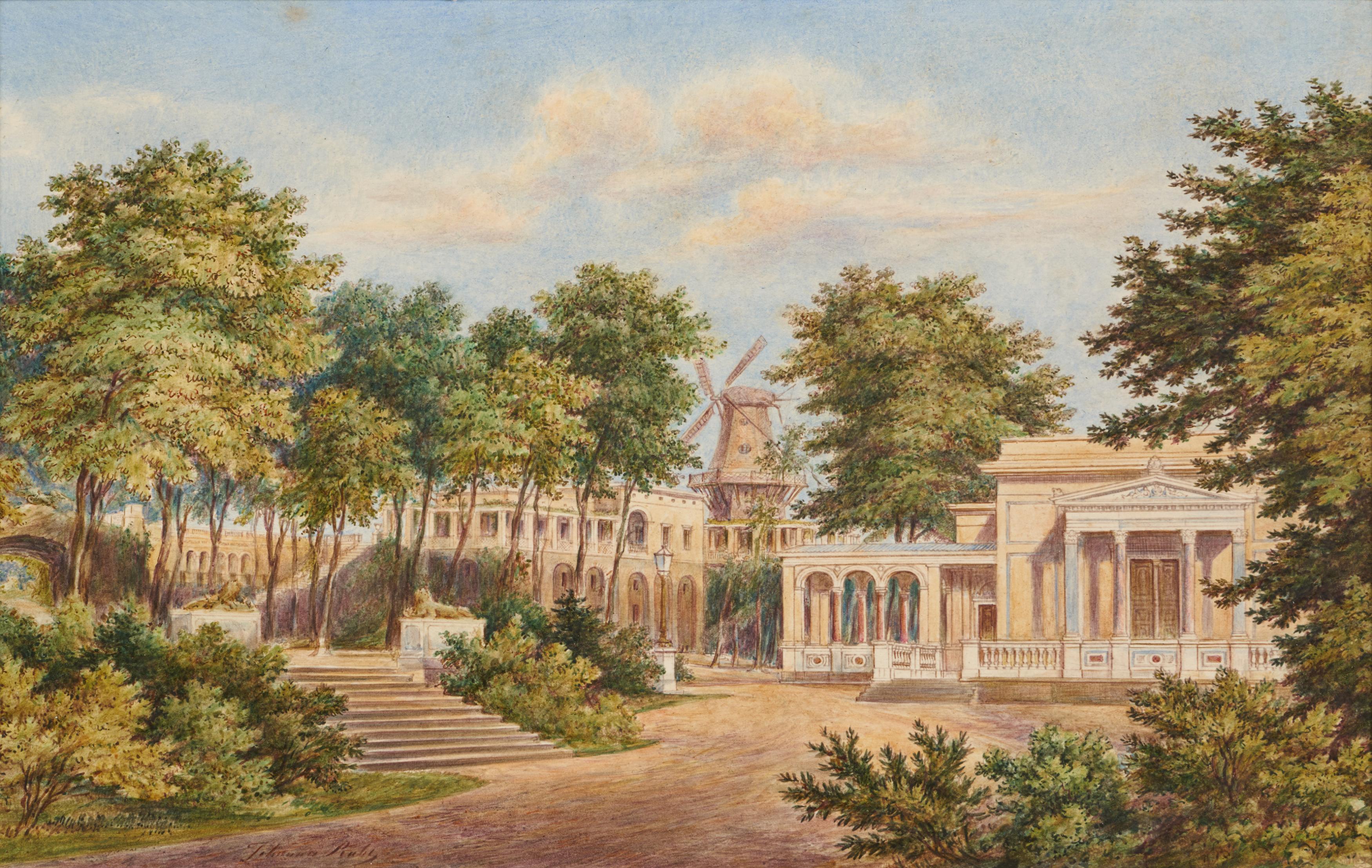 Schlosspark Sanssouci mit Windmühle. 18,5 x 25,5cm. Unleserlich signiert..