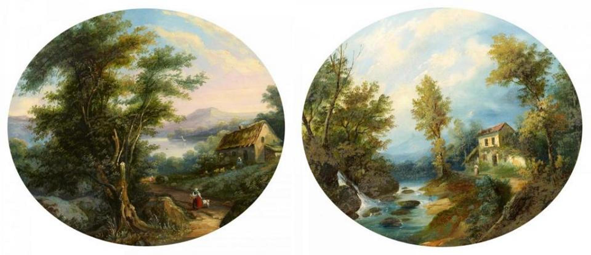 Zwei Gemälde: Gebirgslandschaften. Öl auf Leinwand. Auf Glas geklebt. 46 x 54cm. Im Oval. Rahmen.