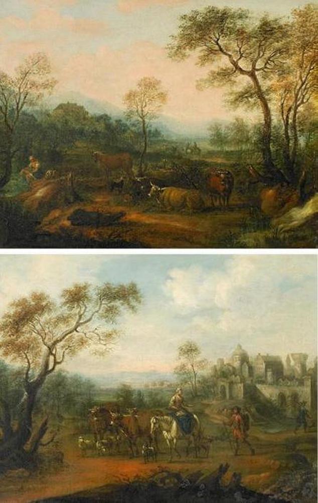 Zwei Gemälde. Landschaften mit Viehhirten. Öl auf Leinwand. Doubliert. 32,5 x 42,5cm. Rahmen.