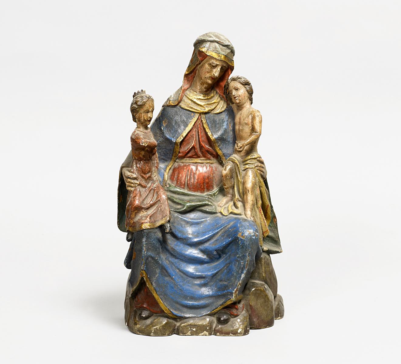 Maria mit Jesuskind und Johannesknaben. Polychrom gefasst. Bestoßungen. Weichholz. Höhe: 34cm.