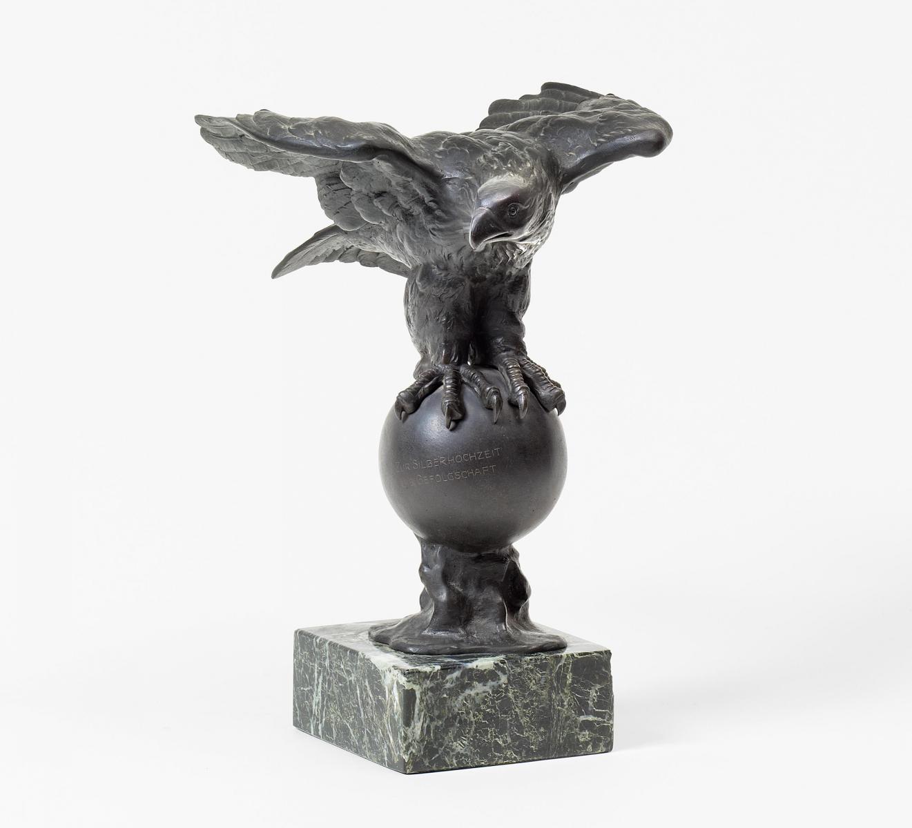 Adler. Bronze. Höhe: 27cm. Auf der Plinthe: Schüler,. Sowie: Gießerstempel Bildgiesserei Kraas Berlin. Sockel.