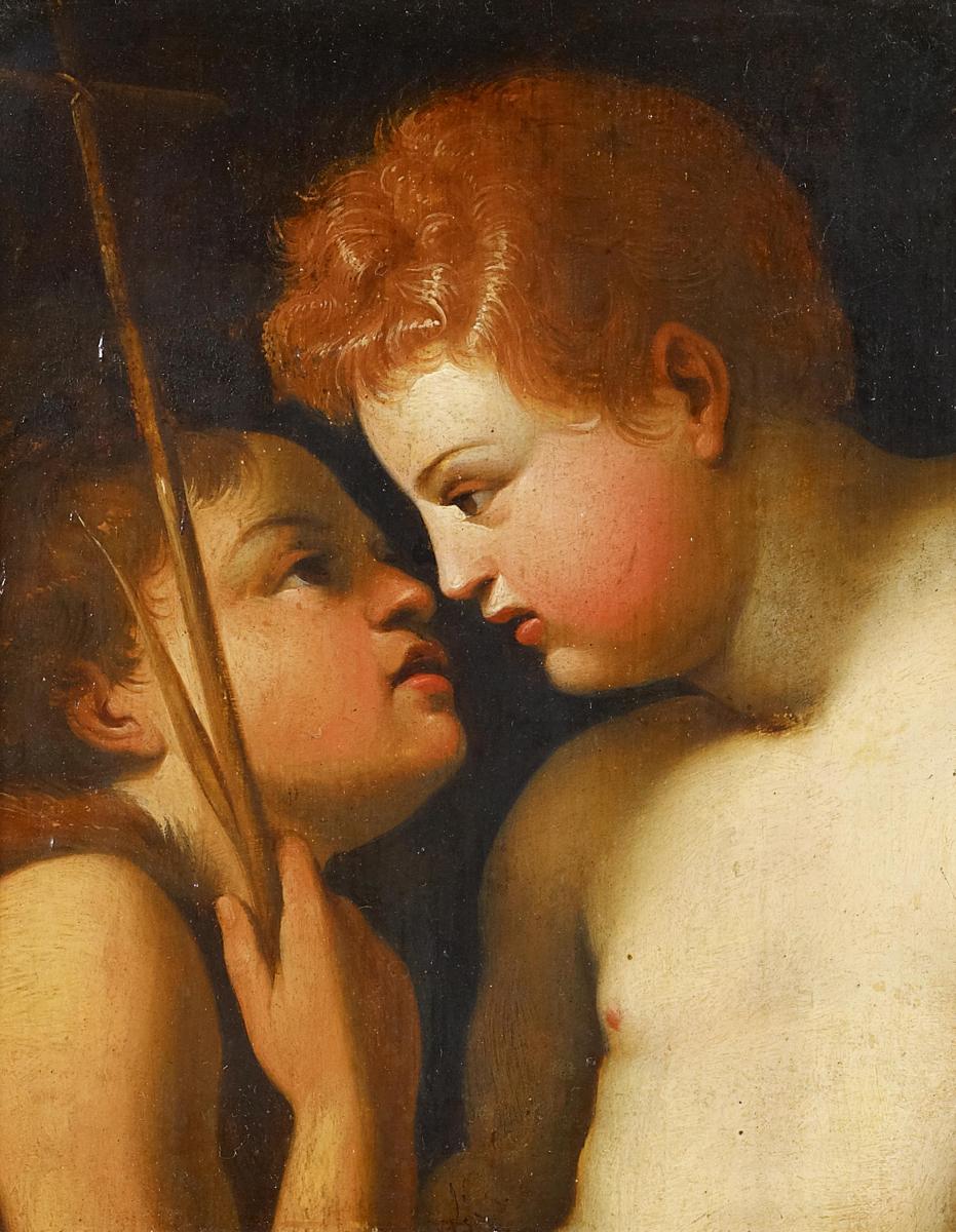 Chistus und Johannes als Knaben. Öl auf Eichenholz. 17,5 x 15cm. Rahmen.