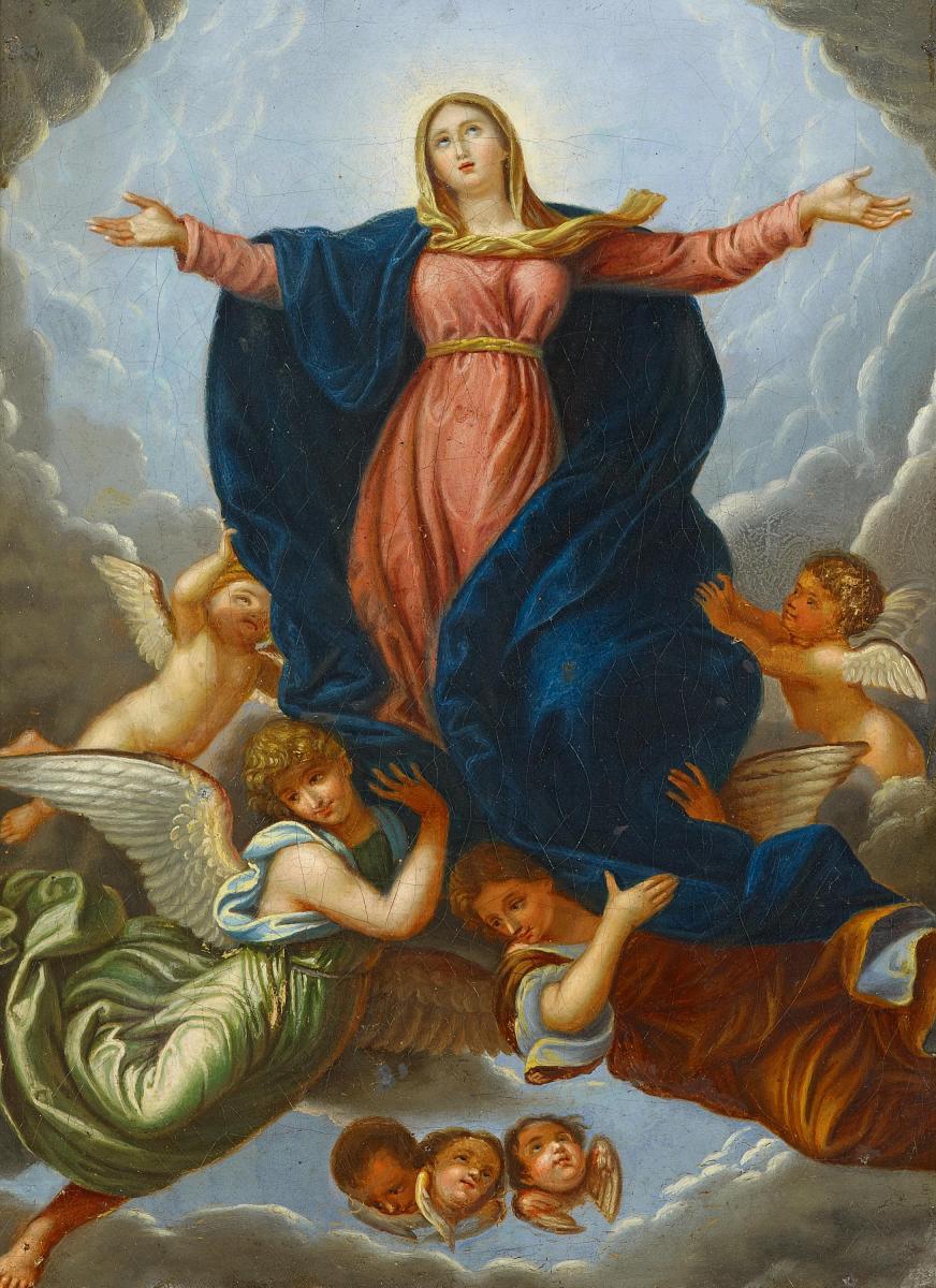 Maria Himmelfahrt. Öl auf Leinwand. Auf Hartfaser aufgezogen. 36 x 27cm. Rahmen.